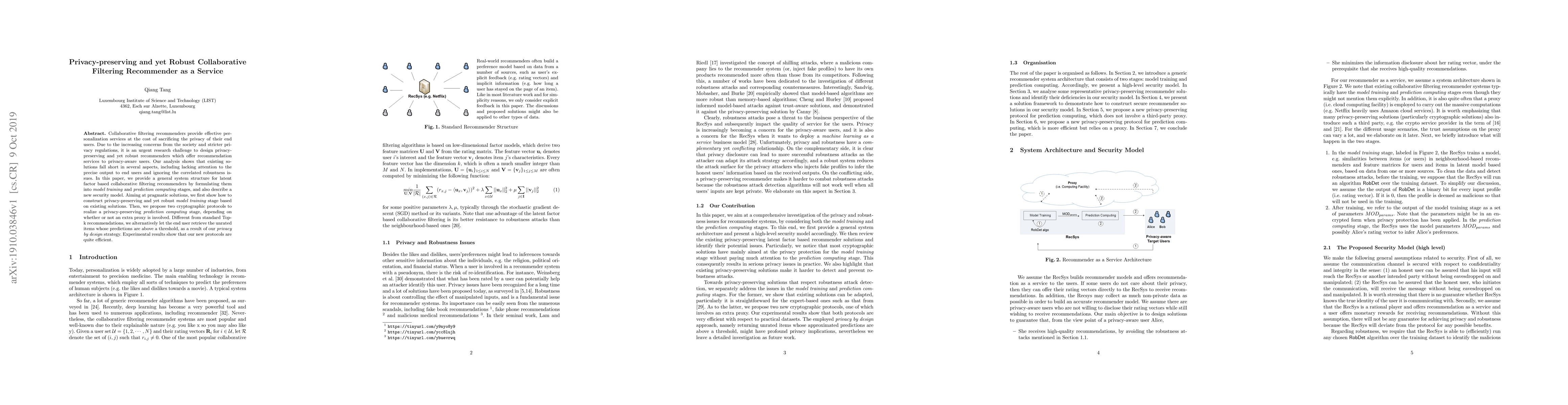 This paper proposes a privacy-preserving and robust collaborative filtering recommender system that addresses the lack of privacy and robustness in existing solutions. It introduces a new security model and cryptographic protocols for secure model training and prediction, allowing users to retrieve unrated items with high prediction scores, thereby enhancing privacy.