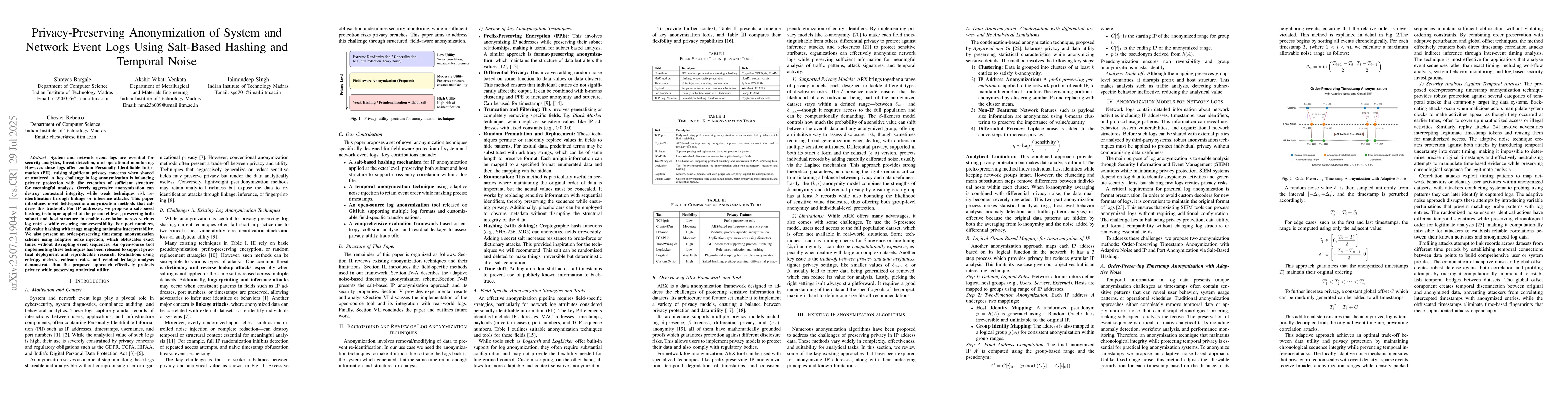 System and network event logs are essential for security analytics, threat detection, and operational monitoring. However, these logs often contain Personally Identifiable Information (PII), raising significant privacy concerns when shared or analyzed. A key challenge in log anonymization is balancing privacy protection with the retention of sufficient structure for meaningful analysis. Overly aggressive anonymization can destroy contextual integrity, while weak techniques risk re-identification through linkage or inference attacks. This paper introduces novel field-specific anonymization methods that address this trade-off. For IP addresses, we propose a salt-based hashing technique applied at the per-octet level, preserving both subnet and host structure to enable correlation across various log entries while ensuring non-reversibility. For port numbers, full-value hashing with range mapping maintains interpretability. We also present an order-preserving timestamp anonymization scheme using adaptive noise injection, which obfuscates exact times without disrupting event sequences. An open-source tool implementing these techniques has been released to support practical deployment and reproducible research. Evaluations using entropy metrics, collision rates, and residual leakage analysis demonstrate that the proposed approach effectively protects privacy while preserving analytical utility.