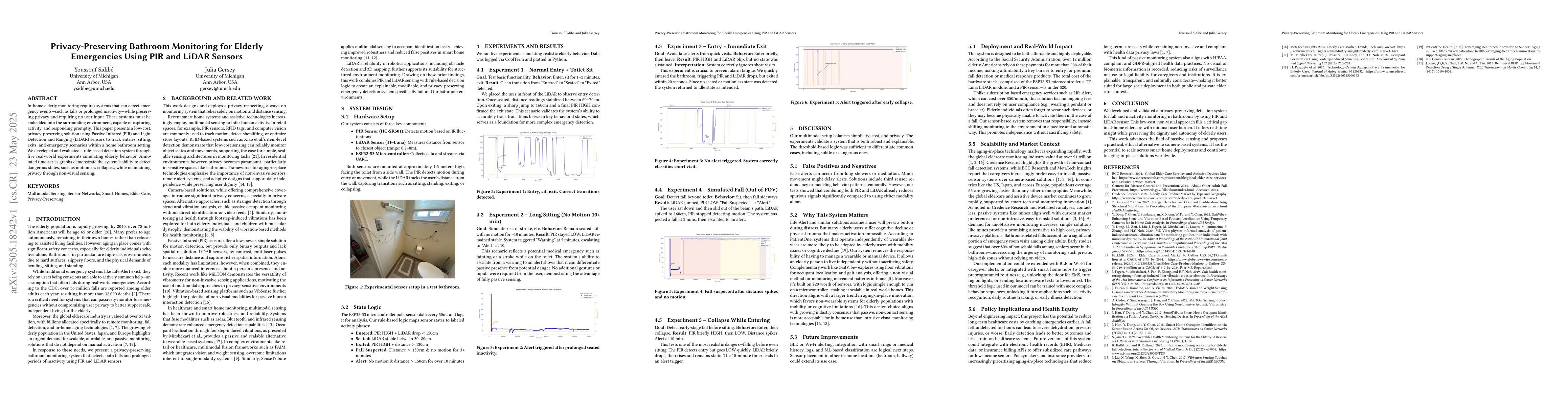 In-home elderly monitoring requires systems that can detect emergency events - such as falls or prolonged inactivity - while preserving privacy and requiring no user input. These systems must be embedded into the surrounding environment, capable of capturing activity, and responding promptly. This paper presents a low-cost, privacy-preserving solution using Passive Infrared (PIR) and Light Detection and Ranging (LiDAR) sensors to track entries, sitting, exits, and emergency scenarios within a home bathroom setting. We developed and evaluated a rule-based detection system through five real-world experiments simulating elderly behavior. Annotated time-series graphs demonstrate the system's ability to detect dangerous states, such as motionless collapses, while maintaining privacy through non-visual sensing.
