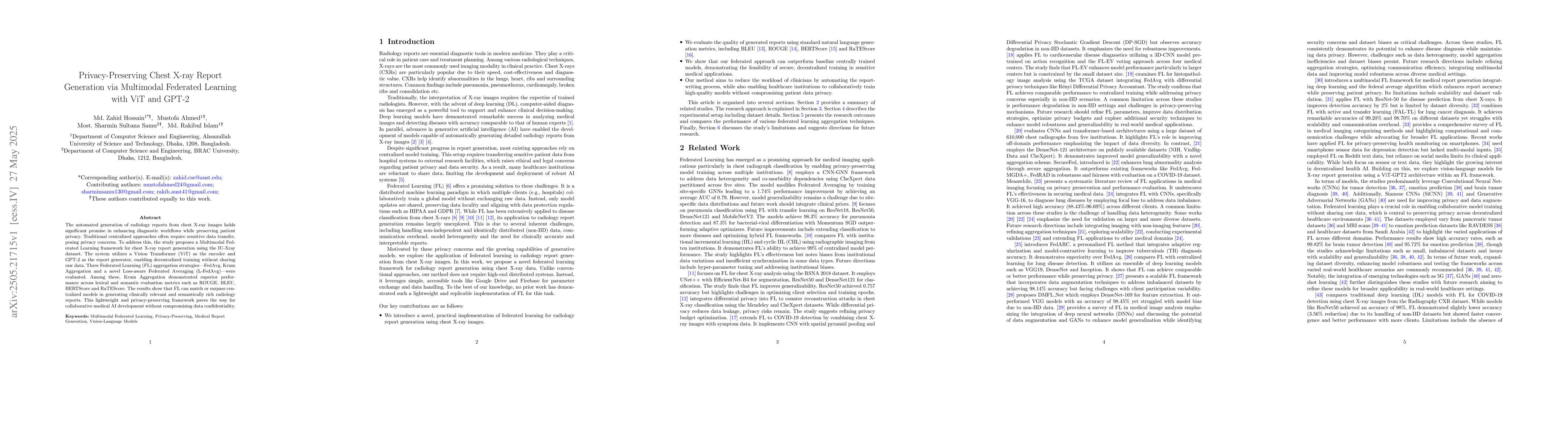 Researchers developed a privacy-preserving framework for generating radiology reports from chest X-ray images using Federated Learning with Vision Transformer and GPT-2. The framework achieved comparable performance to centralized models while protecting patient data.