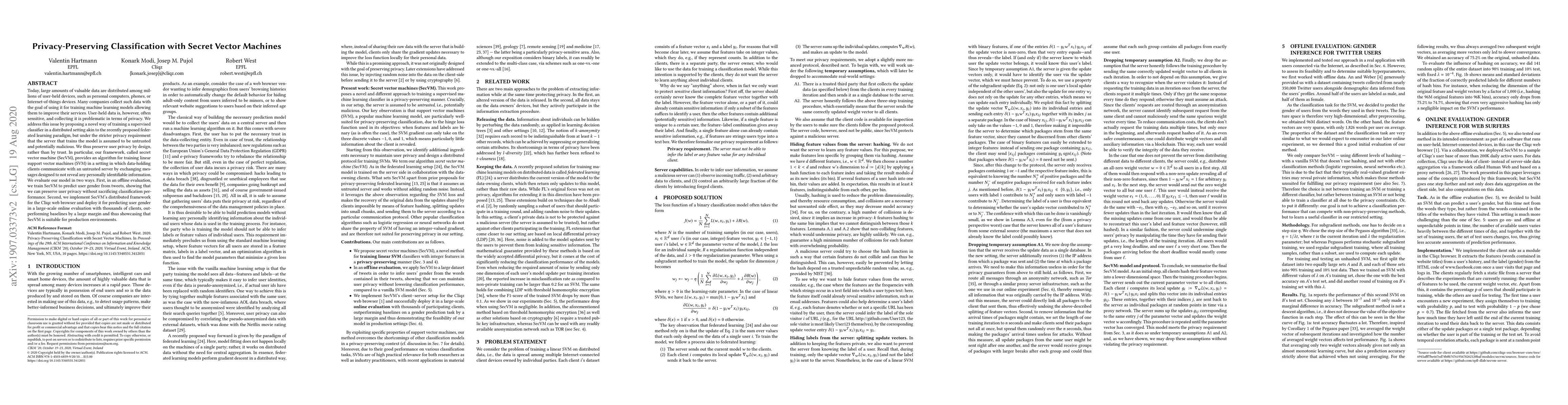 This research introduces Secret Vector Machines (SecVM), a framework for training linear support vector machines (SVM) in a distributed setting where user data remains private even if the server is untrusted and potentially malicious. SecVM ensures privacy by design, using message exchanges that do not reveal personally identifiable information. The methodology is validated through offline evaluations on predicting user gender from tweets and a large-scale online evaluation with Cliqz web browser, demonstrating competitive performance and suitability for real-world applications.
