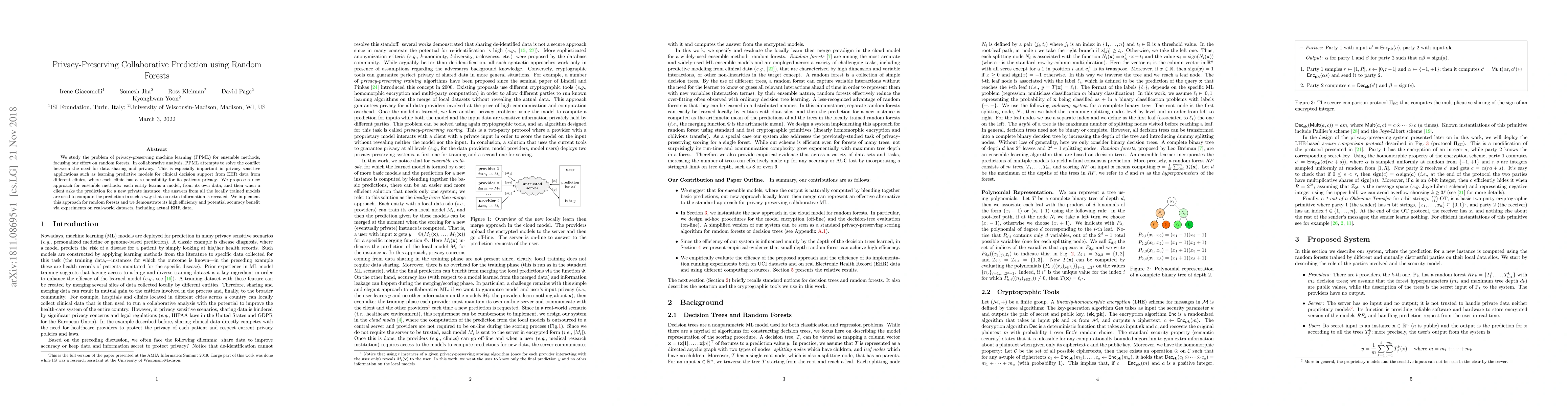 This paper proposes a privacy-preserving method for collaborative prediction using random forests, where each entity trains a model locally and shares predictions without revealing extra data, addressing privacy concerns in sensitive applications like clinical decision support. The approach demonstrates high efficiency and potential accuracy benefits through experiments on real-world datasets, including electronic health records (EHR).