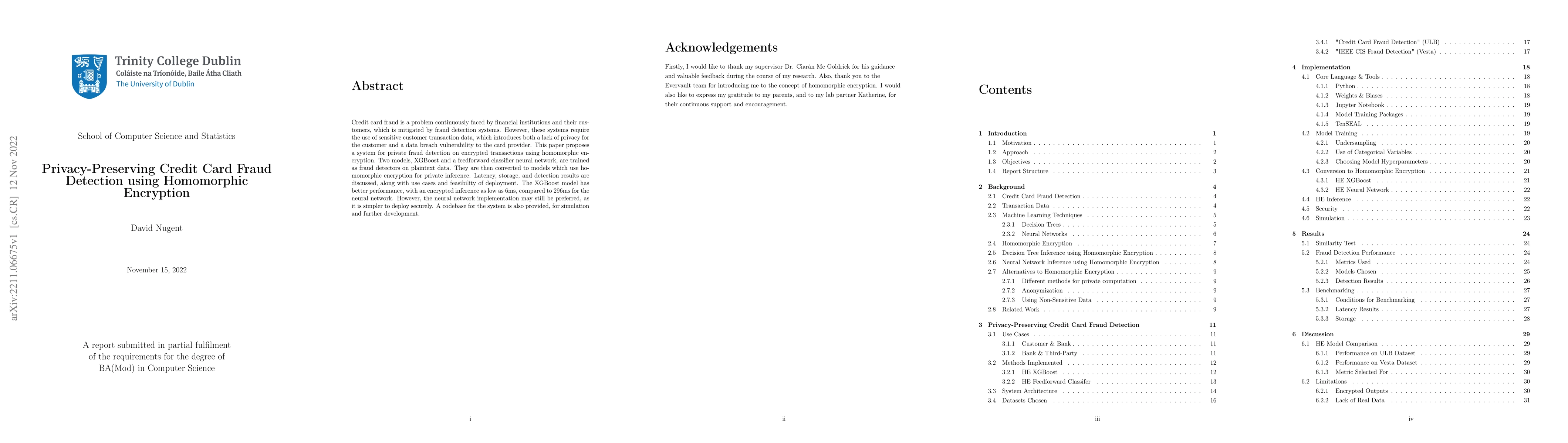This paper proposes a privacy-preserving credit card fraud detection system using homomorphic encryption, training XGBoost and neural network models on encrypted data. The XGBoost model shows better performance with low latency, but the neural network is simpler to deploy securely.