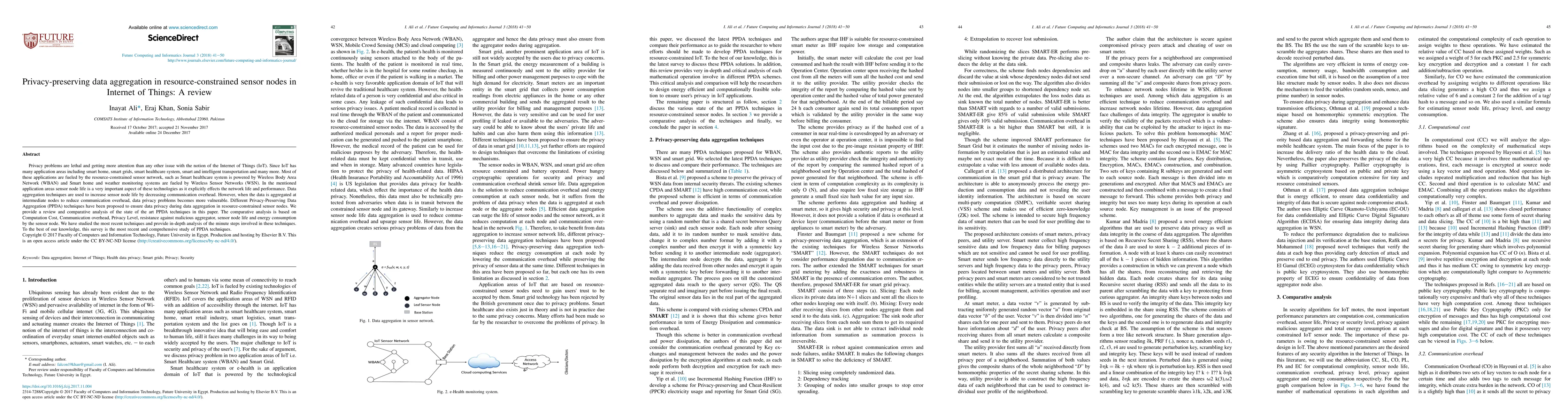 This paper reviews state-of-the-art Privacy-Preserving Data Aggregation (PPDA) techniques for resource-constrained sensor nodes in IoT applications, focusing on computation cost, communication overhead, privacy level, and energy consumption. It provides a comparative analysis of recent PPDA methods to enhance data privacy while maintaining sensor node longevity.