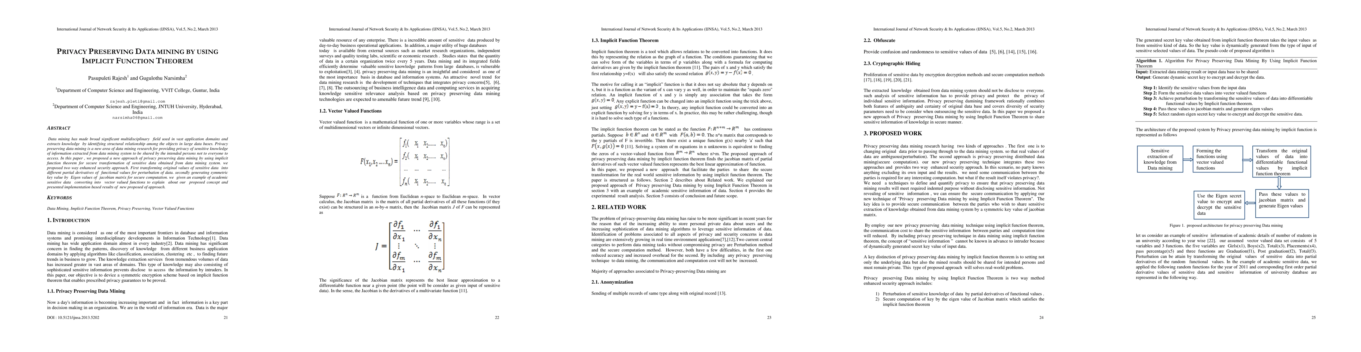 This paper proposes a novel privacy-preserving data mining method using the implicit function theorem to secure sensitive data. It employs data transformation through partial derivatives and symmetric key generation via Jacobian matrix eigenvalues for secure computation.