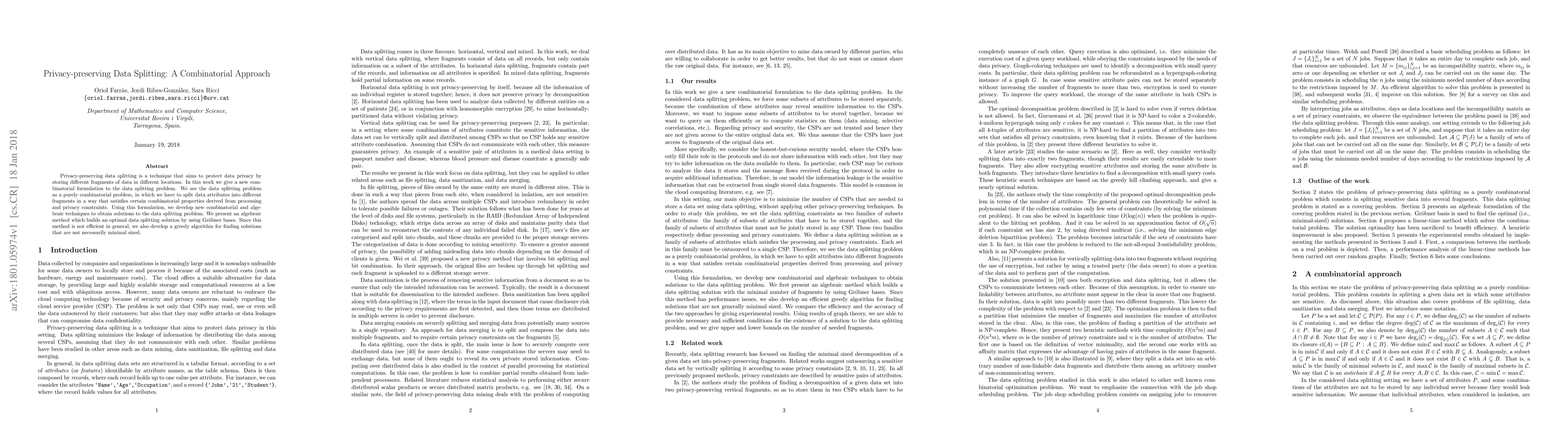 This paper introduces a new combinatorial approach to privacy-preserving data splitting, formulating it as a combinatorial problem to satisfy processing and privacy constraints. It presents an algebraic method using Gröbner bases for optimal solutions and a greedy algorithm for more practical, though non-minimal, solutions.
