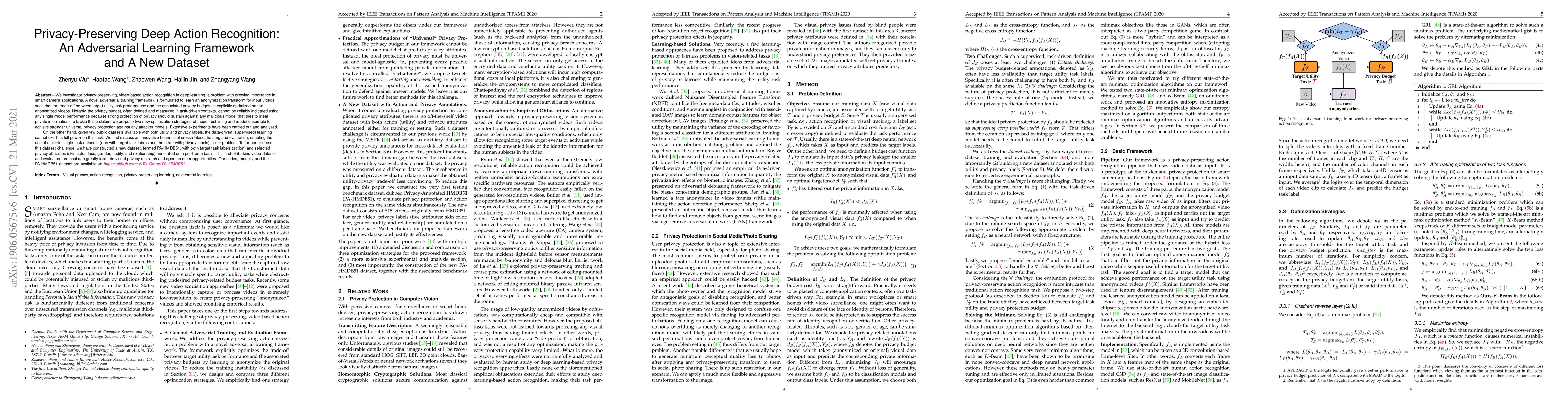 This paper proposes an adversarial learning framework for privacy-preserving deep action recognition, optimizing the trade-off between recognition accuracy and privacy protection. It introduces new strategies for universal privacy protection and constructs a novel dataset, PA-HMDB51, with both action labels and privacy attributes to facilitate research in this area.