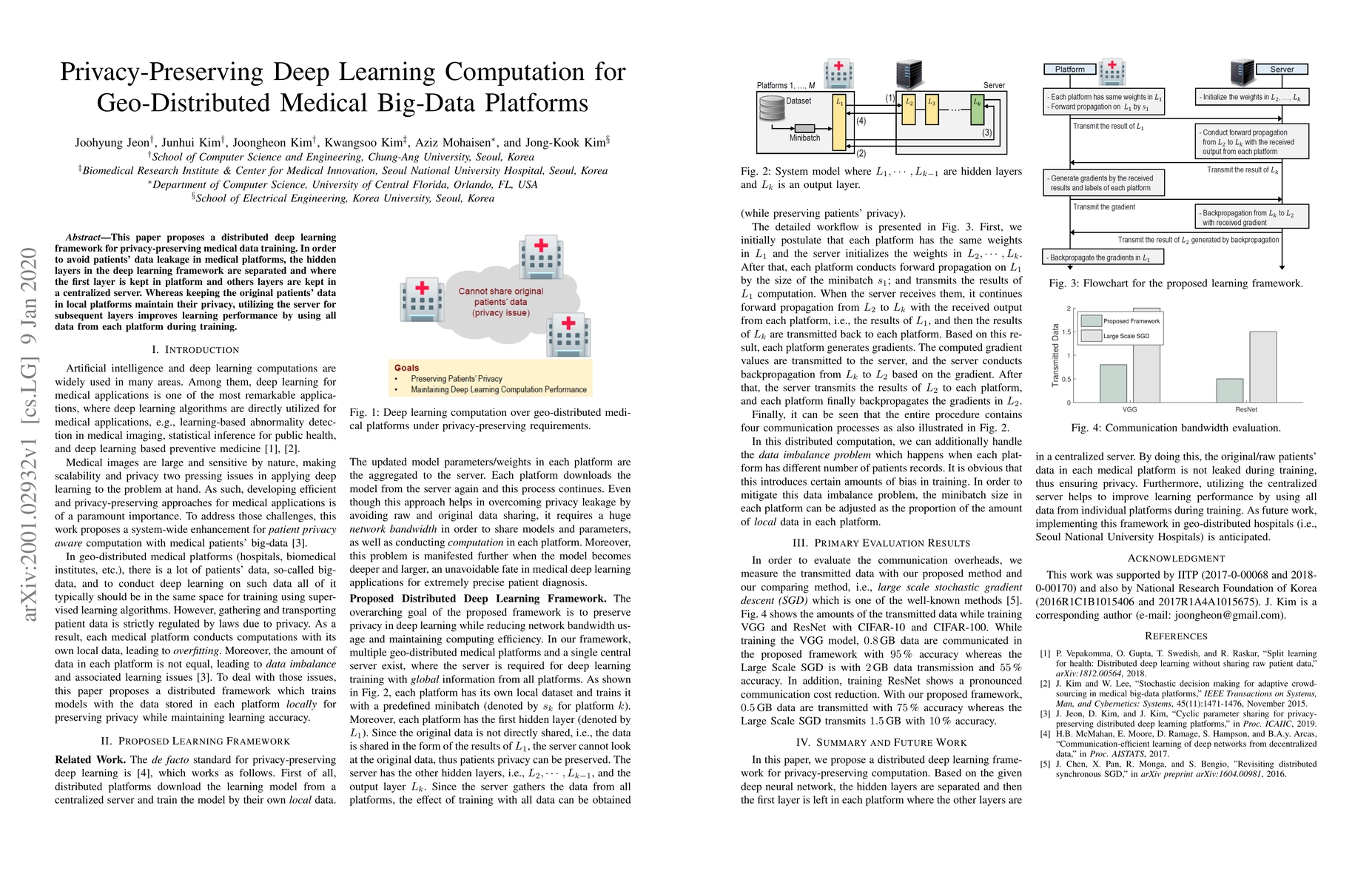 This paper introduces a distributed deep learning framework that preserves patient privacy in geo-distributed medical big-data platforms by keeping the first layer on local platforms and subsequent layers on a centralized server, thus preventing data leakage while enhancing learning performance.