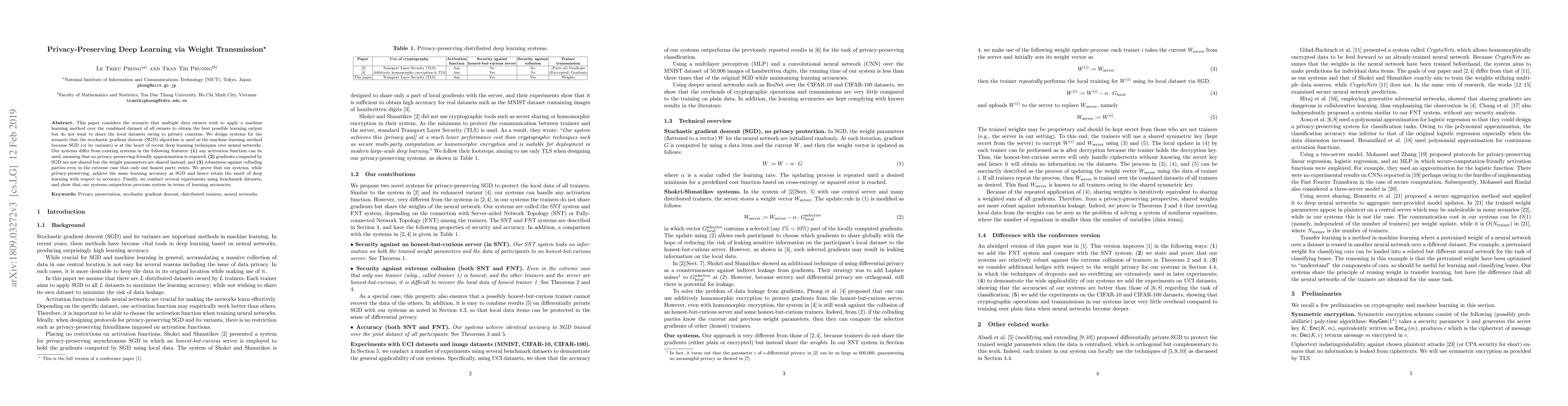 This paper proposes a privacy-preserving deep learning framework using weight transmission instead of gradient sharing, allowing any activation function and maintaining robustness against colluding parties. The system achieves the same learning accuracy as standard SGD while preserving data privacy.