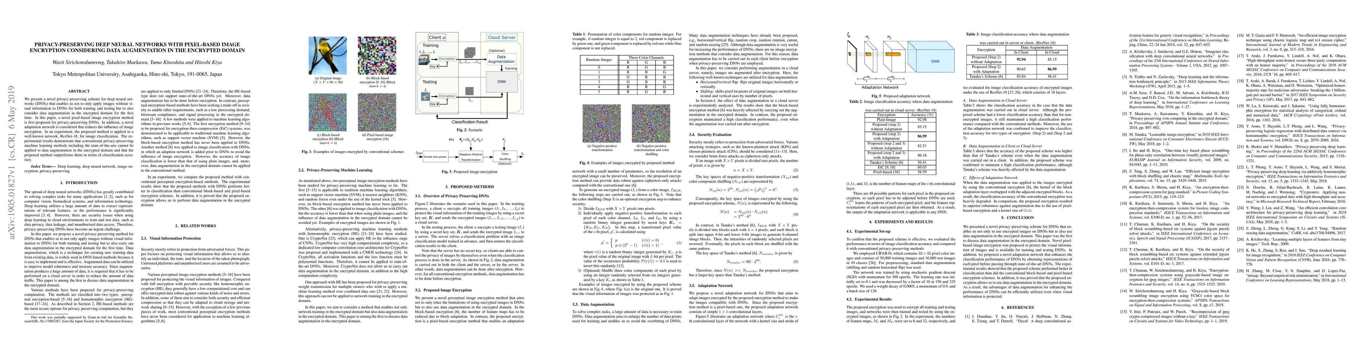 This paper introduces a novel privacy-preserving scheme for deep neural networks using pixel-based image encryption and data augmentation in the encrypted domain, achieving higher classification accuracy compared to state-of-the-art methods. The proposed method employs a new adaptation network to mitigate the effects of encryption on image classification.
