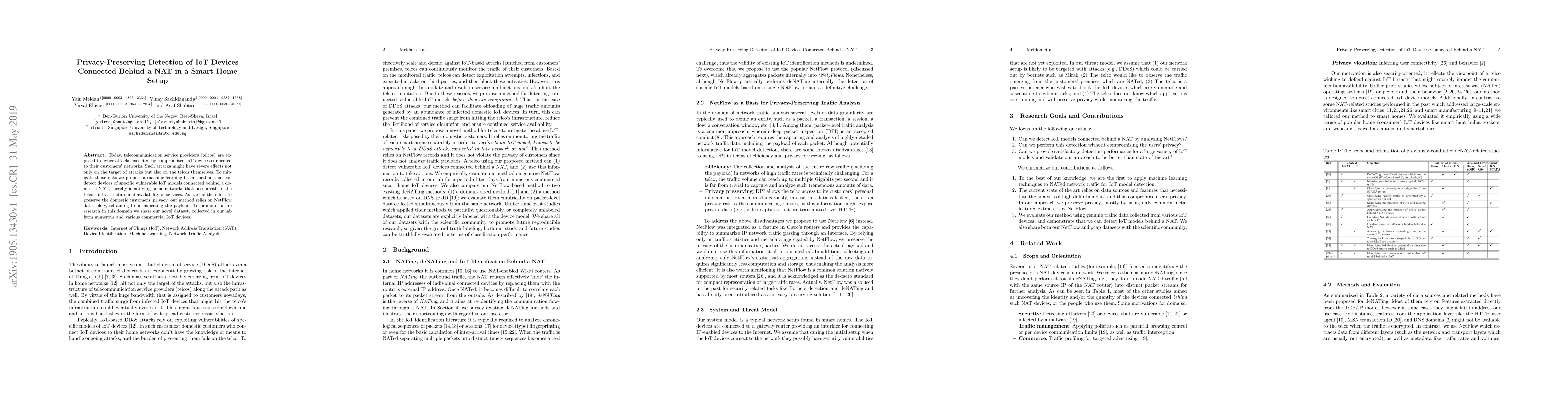 Today, telecommunication service providers (telcos) are exposed to cyber-attacks executed by compromised IoT devices connected to their customers' networks. Such attacks might have severe effects not only on the target of attacks but also on the telcos themselves. To mitigate those risks we propose a machine learning based method that can detect devices of specific vulnerable IoT models connected behind a domestic NAT, thereby identifying home networks that pose a risk to the telco's infrastructure and availability of services. As part of the effort to preserve the domestic customers' privacy, our method relies on NetFlow data solely, refraining from inspecting the payload. To promote future research in this domain we share our novel dataset, collected in our lab from numerous and various commercial IoT devices.