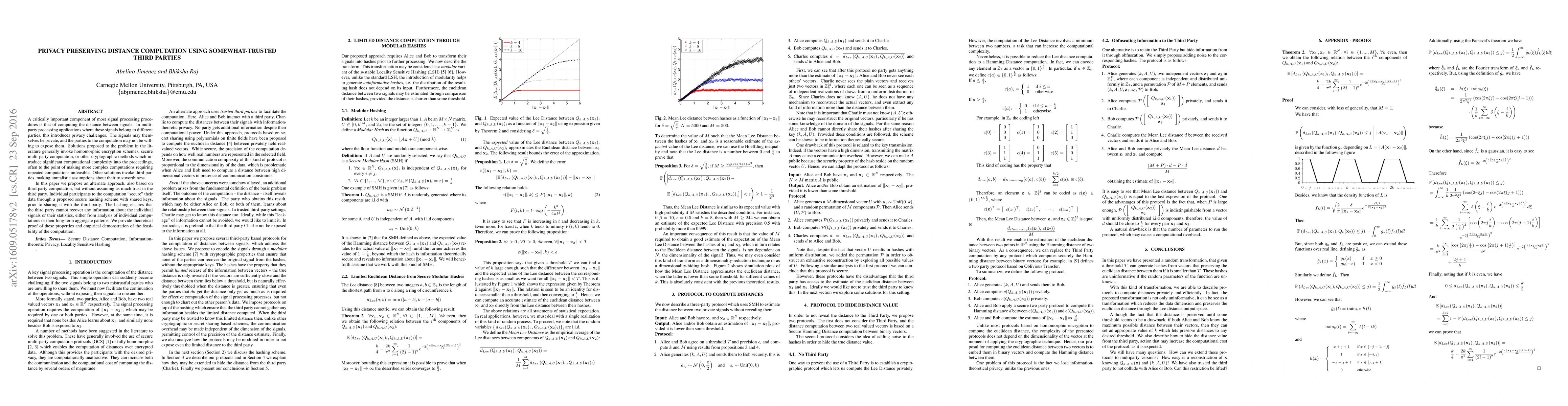 The paper proposes a method for privacy-preserving distance computation using a somewhat-trusted third party, involving secure hashing of signals before sharing with the third party to ensure privacy.