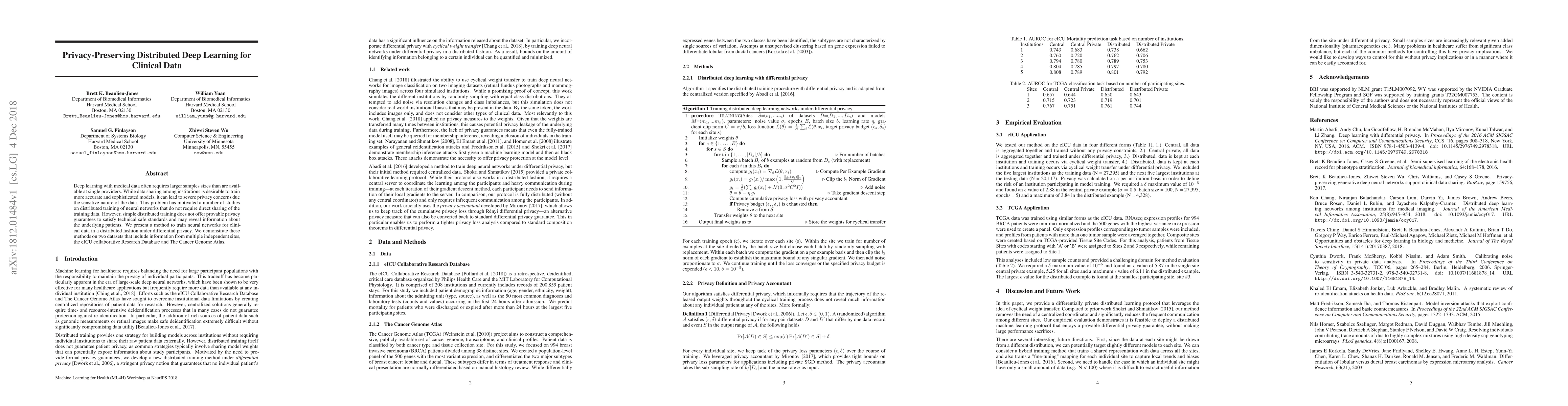 This paper proposes a method for privacy-preserving distributed deep learning to train neural networks on clinical data without sharing the actual data, using differential privacy to ensure technical safe standards and protect patient privacy. The method is demonstrated on two large datasets, the eICU collaborative Research Database and The Cancer Genome Atlas.