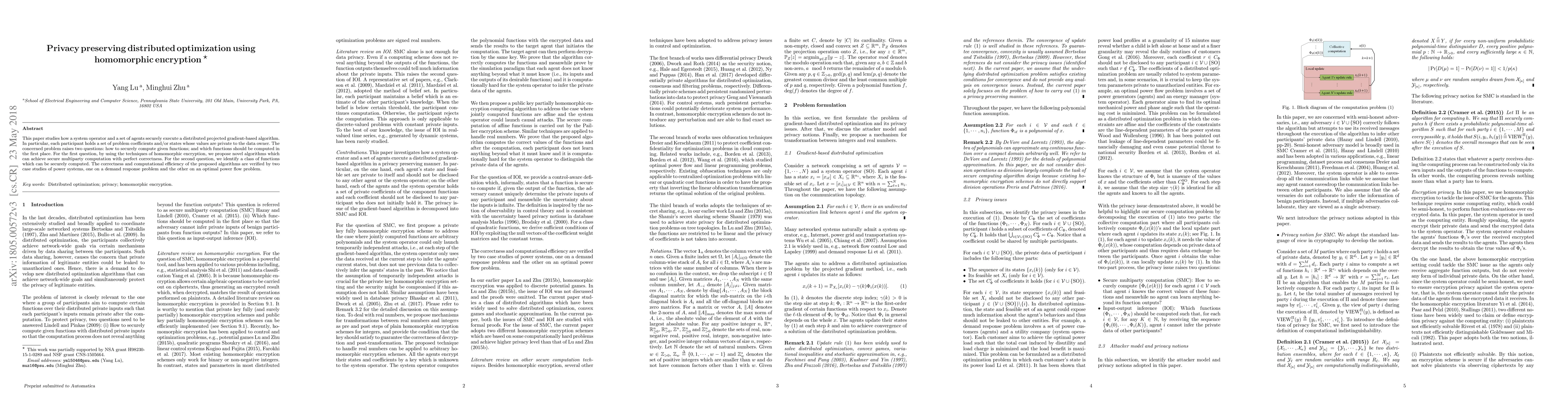 This paper proposes novel algorithms using homomorphic encryption for secure multiparty computation in distributed optimization, ensuring perfect correctness while identifying secure functions to compute. Case studies on demand response and optimal power flow in power systems demonstrate the algorithms' correctness and efficiency.