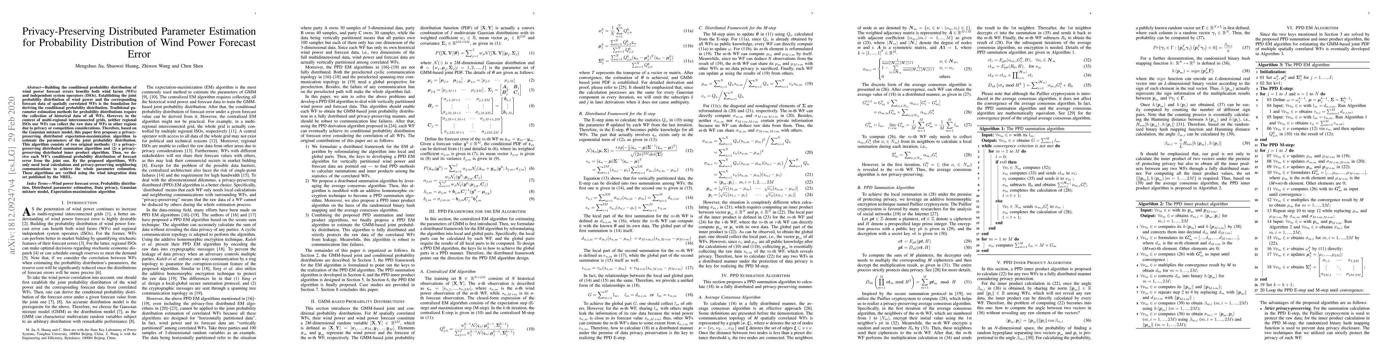 This paper proposes privacy-preserving distributed algorithms for estimating the joint probability distribution of wind power forecast errors across spatially correlated wind farms, using a Gaussian mixture model. The algorithms enable local calculations and privacy-preserving communications, avoiding the need for centralized data collection.