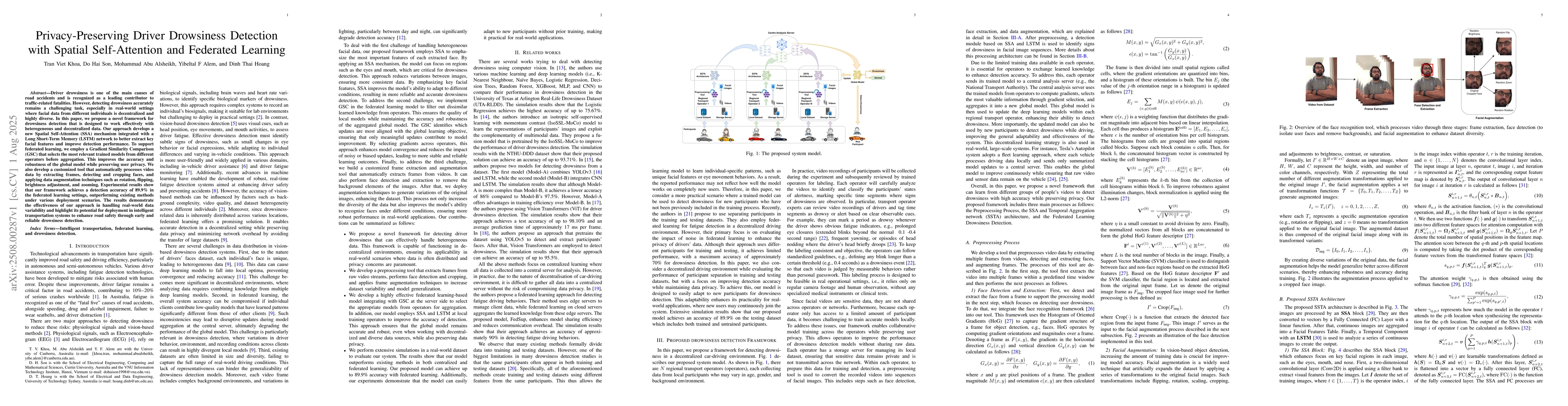 Driver drowsiness is one of the main causes of road accidents and is recognized as a leading contributor to traffic-related fatalities. However, detecting drowsiness accurately remains a challenging task, especially in real-world settings where facial data from different individuals is decentralized and highly diverse. In this paper, we propose a novel framework for drowsiness detection that is designed to work effectively with heterogeneous and decentralized data. Our approach develops a new Spatial Self-Attention (SSA) mechanism integrated with a Long Short-Term Memory (LSTM) network to better extract key facial features and improve detection performance. To support federated learning, we employ a Gradient Similarity Comparison (GSC) that selects the most relevant trained models from different operators before aggregation. This improves the accuracy and robustness of the global model while preserving user privacy. We also develop a customized tool that automatically processes video data by extracting frames, detecting and cropping faces, and applying data augmentation techniques such as rotation, flipping, brightness adjustment, and zooming. Experimental results show that our framework achieves a detection accuracy of 89.9% in the federated learning settings, outperforming existing methods under various deployment scenarios. The results demonstrate the effectiveness of our approach in handling real-world data variability and highlight its potential for deployment in intelligent transportation systems to enhance road safety through early and reliable drowsiness detection.