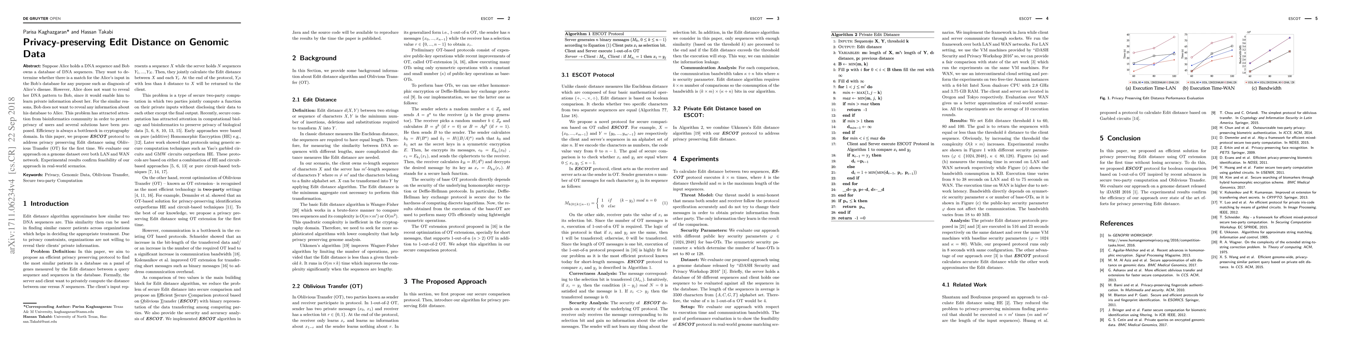 This paper proposes the ESCOT protocol to enable privacy-preserving Edit Distance calculations on genomic data using Oblivious Transfer, ensuring neither Alice nor Bob reveals sensitive information. Experimental results demonstrate the protocol's feasibility in real-world scenarios over LAN and WAN networks.