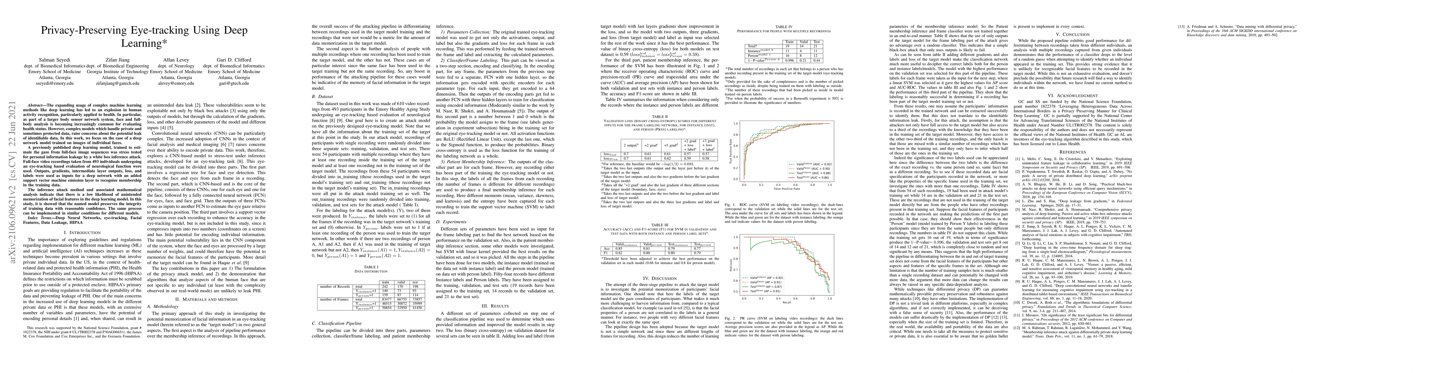The expanding usage of complex machine learning methods like deep learning has led to an explosion in human activity recognition, particularly applied to health. In particular, as part of a larger body sensor network system, face and full-body analysis is becoming increasingly common for evaluating health status. However, complex models which handle private and sometimes protected data, raise concerns about the potential leak of identifiable data. In this work, we focus on the case of a deep network model trained on images of individual faces. Full-face video recordings taken from 493 individuals undergoing an eye-tracking based evaluation of neurological function were used. Outputs, gradients, intermediate layer outputs, loss, and labels were used as inputs for a deep network with an added support vector machine emission layer to recognize membership in the training data. The inference attack method and associated mathematical analysis indicate that there is a low likelihood of unintended memorization of facial features in the deep learning model. In this study, it is showed that the named model preserves the integrity of training data with reasonable confidence. The same process can be implemented in similar conditions for different models.