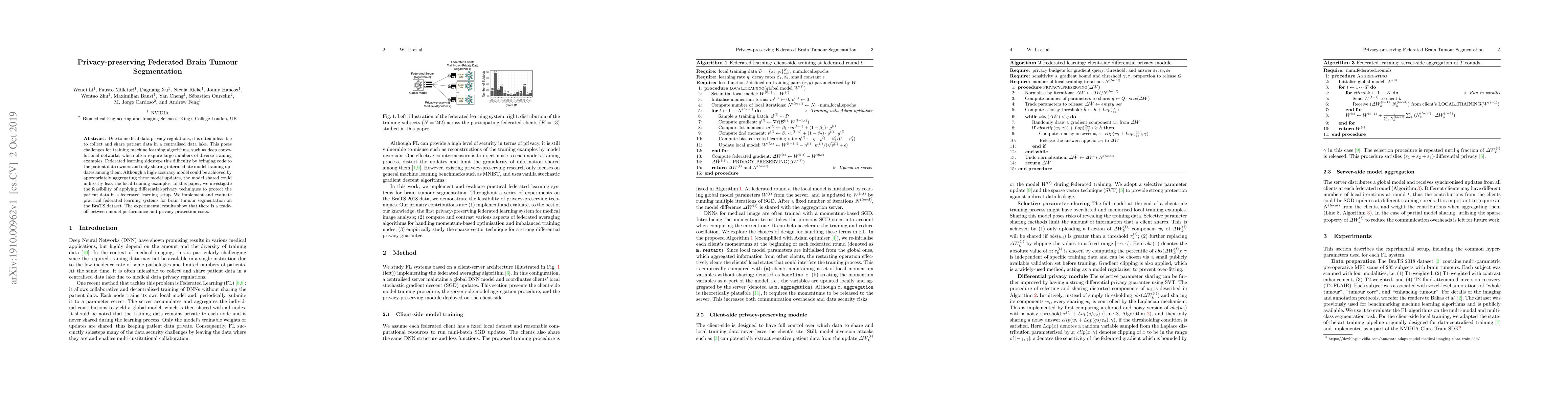 Due to medical data privacy regulations, it is often infeasible to collect and share patient data in a centralised data lake. This poses challenges for training machine learning algorithms, such as deep convolutional networks, which often require large numbers of diverse training examples. Federated learning sidesteps this difficulty by bringing code to the patient data owners and only sharing intermediate model training updates among them. Although a high-accuracy model could be achieved by appropriately aggregating these model updates, the model shared could indirectly leak the local training examples. In this paper, we investigate the feasibility of applying differential-privacy techniques to protect the patient data in a federated learning setup. We implement and evaluate practical federated learning systems for brain tumour segmentation on the BraTS dataset. The experimental results show that there is a trade-off between model performance and privacy protection costs.