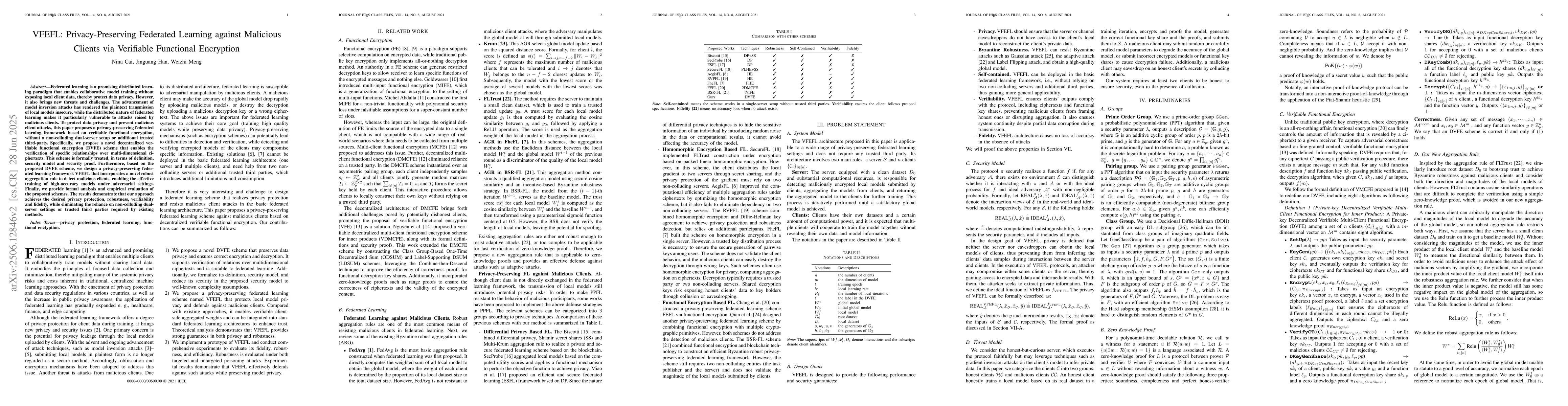 Federated learning is a promising distributed learning paradigm that enables collaborative model training without exposing local client data, thereby protect data privacy. However, it also brings new threats and challenges. The advancement of model inversion attacks has rendered the plaintext transmission of local models insecure, while the distributed nature of federated learning makes it particularly vulnerable to attacks raised by malicious clients. To protect data privacy and prevent malicious client attacks, this paper proposes a privacy-preserving federated learning framework based on verifiable functional encryption, without a non-colluding dual-server setup or additional trusted third-party. Specifically, we propose a novel decentralized verifiable functional encryption (DVFE) scheme that enables the verification of specific relationships over multi-dimensional ciphertexts. This scheme is formally treated, in terms of definition, security model and security proof. Furthermore, based on the proposed DVFE scheme, we design a privacy-preserving federated learning framework VFEFL that incorporates a novel robust aggregation rule to detect malicious clients, enabling the effective training of high-accuracy models under adversarial settings. Finally, we provide formal analysis and empirical evaluation of the proposed schemes. The results demonstrate that our approach achieves the desired privacy protection, robustness, verifiability and fidelity, while eliminating the reliance on non-colluding dual-server settings or trusted third parties required by existing methods.
