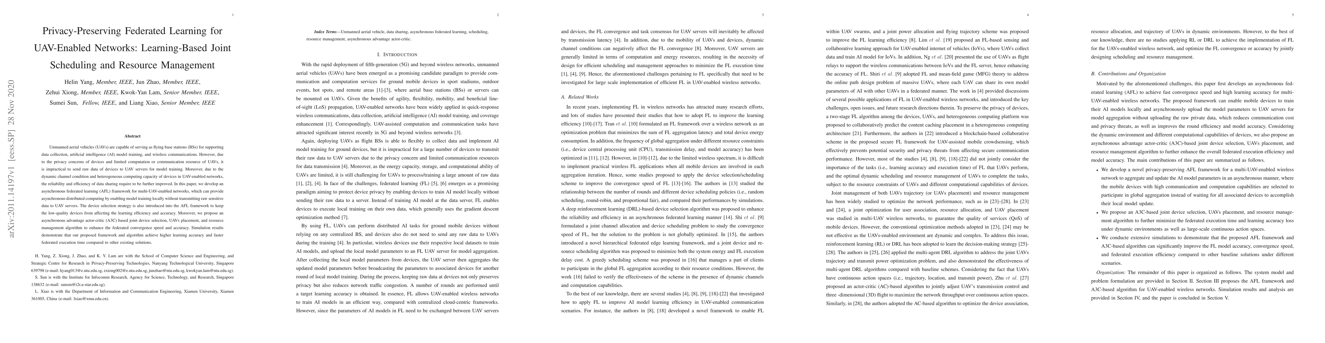 This paper proposes an asynchronous federated learning framework for UAV-enabled networks to enable local model training without transmitting raw data, addressing privacy concerns. It introduces an A3C-based algorithm for joint scheduling and resource management, achieving higher learning accuracy and faster federated execution.