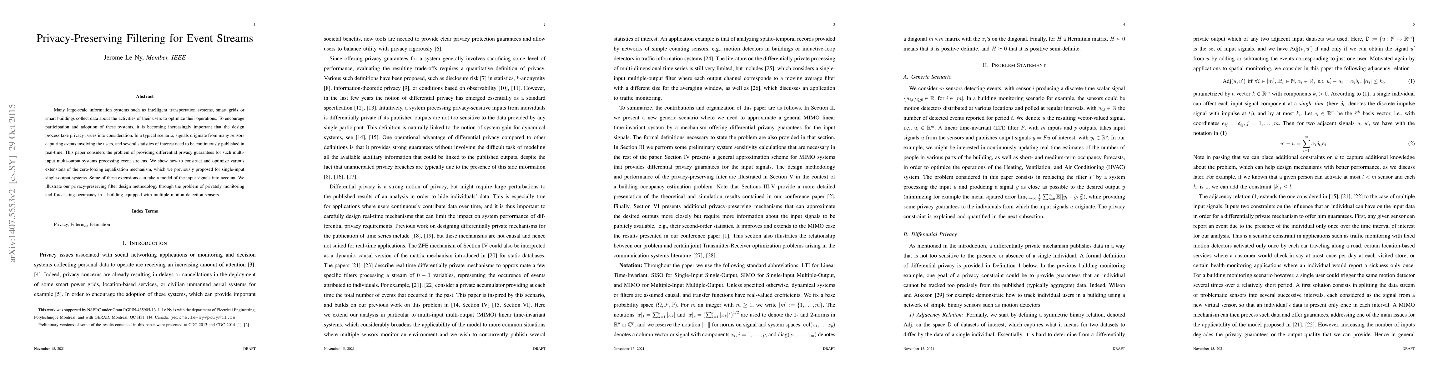 This paper proposes differential privacy techniques for filtering event streams in large-scale systems like smart grids and buildings, optimizing zero-forcing equalization mechanisms to protect user privacy while enabling real-time data statistics. The methodology is demonstrated through privately monitoring occupancy in a multi-sensor building environment.