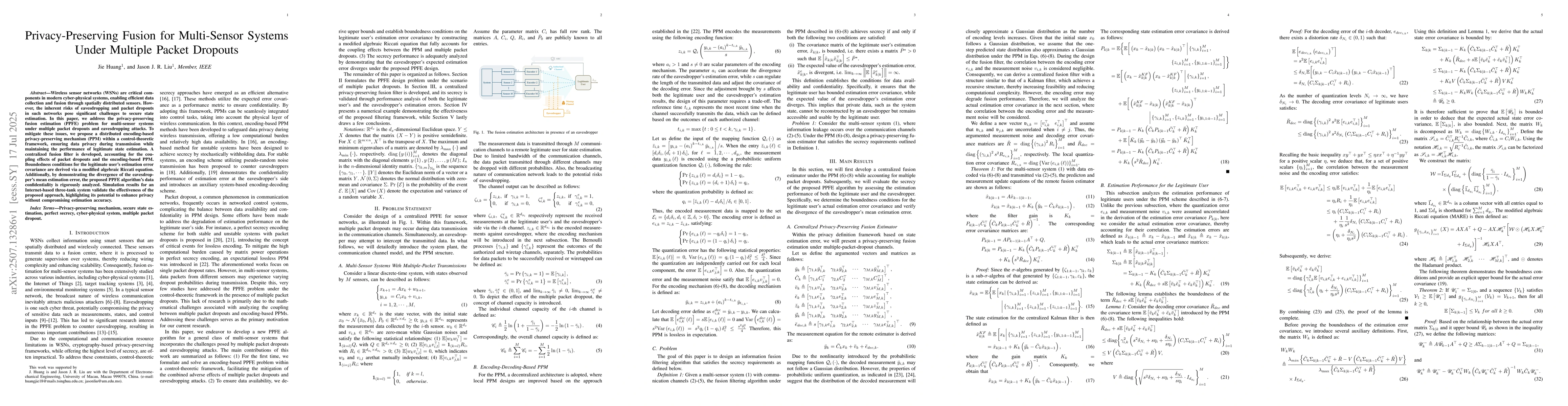 Wireless sensor networks (WSNs) are critical components in modern cyber-physical systems, enabling efficient data collection and fusion through spatially distributed sensors. However, the inherent risks of eavesdropping and packet dropouts in such networks pose significant challenges to secure state estimation. In this paper, we address the privacy-preserving fusion estimation (PPFE) problem for multi-sensor systems under multiple packet dropouts and eavesdropping attacks. To mitigate these issues, we propose a distributed encoding-based privacy-preserving mechanism (PPM) within a control-theoretic framework, ensuring data privacy during transmission while maintaining the performance of legitimate state estimation. A centralized fusion filter is developed, accounting for the coupling effects of packet dropouts and the encoding-based PPM. Boundedness conditions for the legitimate user's estimation error covariance are derived via a modified algebraic Riccati equation. Additionally, by demonstrating the divergence of the eavesdropper's mean estimation error, the proposed PPFE algorithm's data confidentiality is rigorously analyzed. Simulation results for an Internet-based three-tank system validate the effectiveness of the proposed approach, highlighting its potential to enhance privacy without compromising estimation accuracy.
