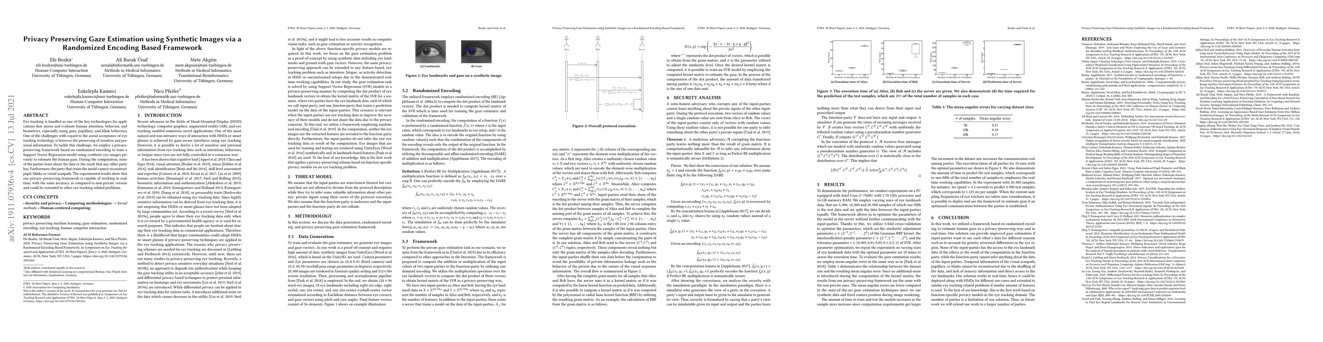 This paper proposes a privacy-preserving framework using randomized encoding to train a gaze estimation model on synthetic images without revealing sensitive data. The method ensures real-time performance with accuracy comparable to non-private models, addressing the challenge of social acceptance in eye tracking technology.