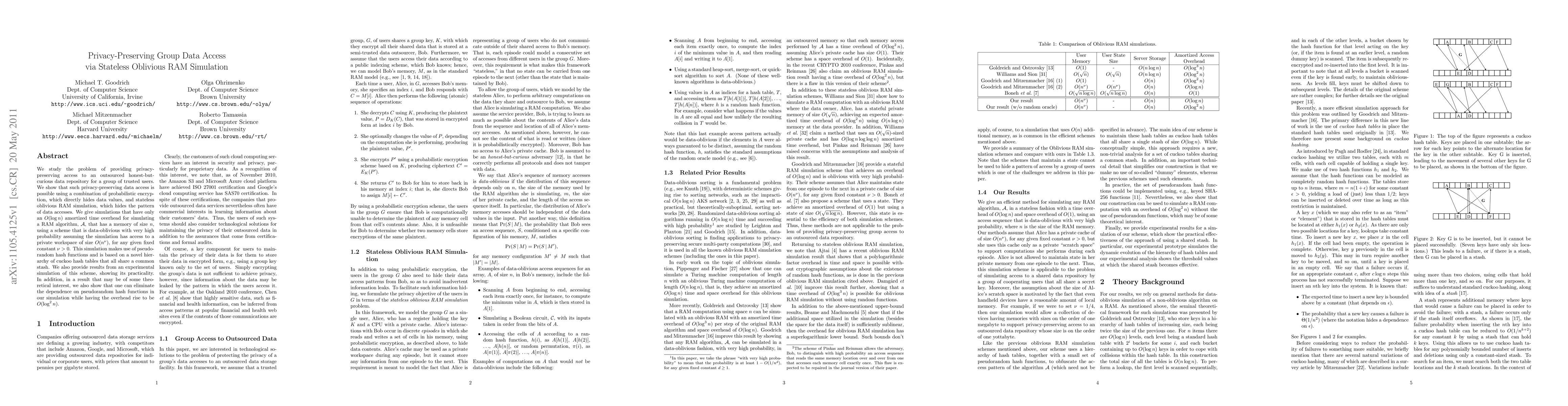 This paper proposes a privacy-preserving method for group data access using stateless oblivious RAM simulation and probabilistic encryption. It demonstrates a simulation with $O(\log n)$ amortized overhead and a novel cuckoo hash table hierarchy, validated through practical experimental results.