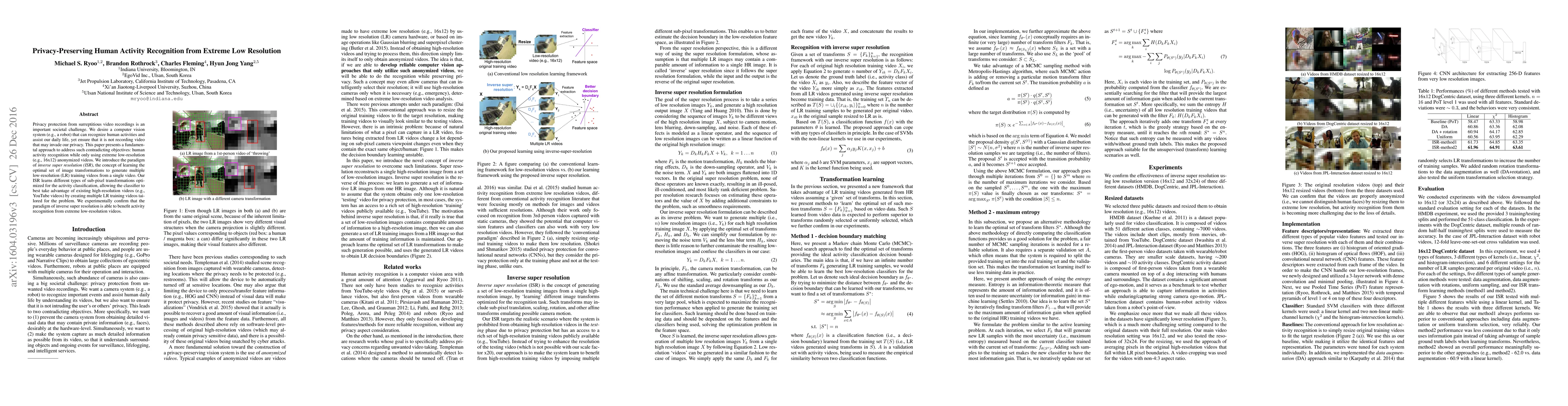 Privacy protection from surreptitious video recordings is an important societal challenge. We desire a computer vision system (e.g., a robot) that can recognize human activities and assist our daily life, yet ensure that it is not recording video that may invade our privacy. This paper presents a fundamental approach to address such contradicting objectives: human activity recognition while only using extreme low-resolution (e.g., 16x12) anonymized videos. We introduce the paradigm of inverse super resolution (ISR), the concept of learning the optimal set of image transformations to generate multiple low-resolution (LR) training videos from a single video. Our ISR learns different types of sub-pixel transformations optimized for the activity classification, allowing the classifier to best take advantage of existing high-resolution videos (e.g., YouTube videos) by creating multiple LR training videos tailored for the problem. We experimentally confirm that the paradigm of inverse super resolution is able to benefit activity recognition from extreme low-resolution videos.