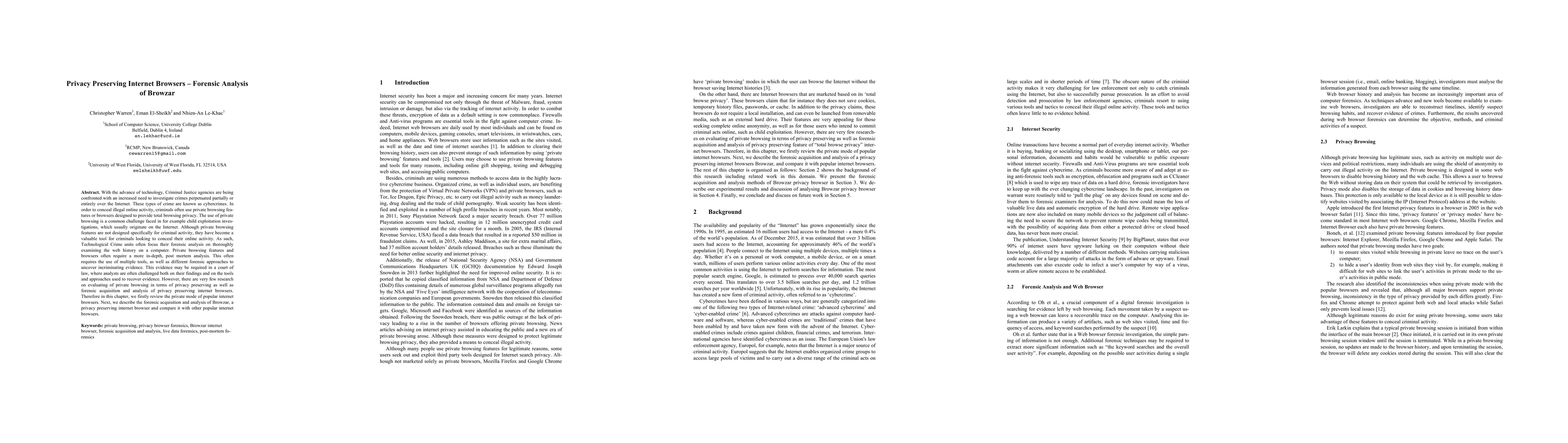 With the advance of technology, Criminal Justice agencies are being confronted with an increased need to investigate crimes perpetuated partially or entirely over the Internet. These types of crime are known as cybercrimes. In order to conceal illegal online activity, criminals often use private browsing features or browsers designed to provide total browsing privacy. The use of private browsing is a common challenge faced in for example child exploitation investigations, which usually originate on the Internet. Although private browsing features are not designed specifically for criminal activity, they have become a valuable tool for criminals looking to conceal their online activity. As such, Technological Crime units often focus their forensic analysis on thoroughly examining the web history on a computer. Private browsing features and browsers often require a more in-depth, post mortem analysis. This often requires the use of multiple tools, as well as different forensic approaches to uncover incriminating evidence. This evidence may be required in a court of law, where analysts are often challenged both on their findings and on the tools and approaches used to recover evidence. However, there are very few research on evaluating of private browsing in terms of privacy preserving as well as forensic acquisition and analysis of privacy preserving internet browsers. Therefore in this chapter, we firstly review the private mode of popular internet browsers. Next, we describe the forensic acquisition and analysis of Browzar, a privacy preserving internet browser and compare it with other popular internet browsers