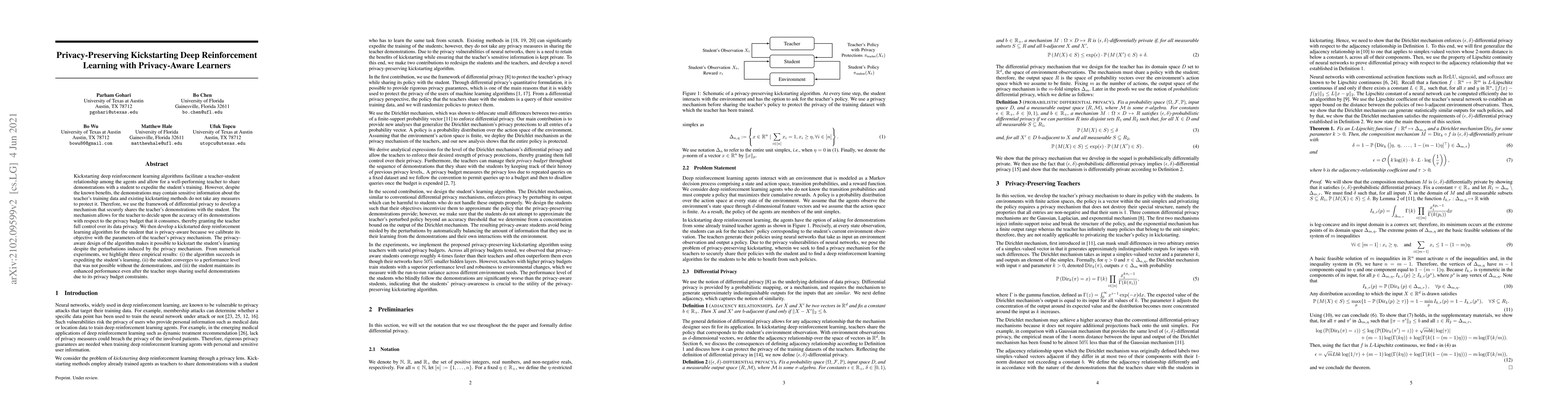 This paper proposes a differential privacy-based mechanism to securely kickstart deep reinforcement learning by sharing teacher demonstrations with a student, while protecting the teacher's sensitive data. The student's algorithm is calibrated to accommodate privacy-induced perturbations, achieving enhanced performance and maintaining it despite privacy budget constraints.