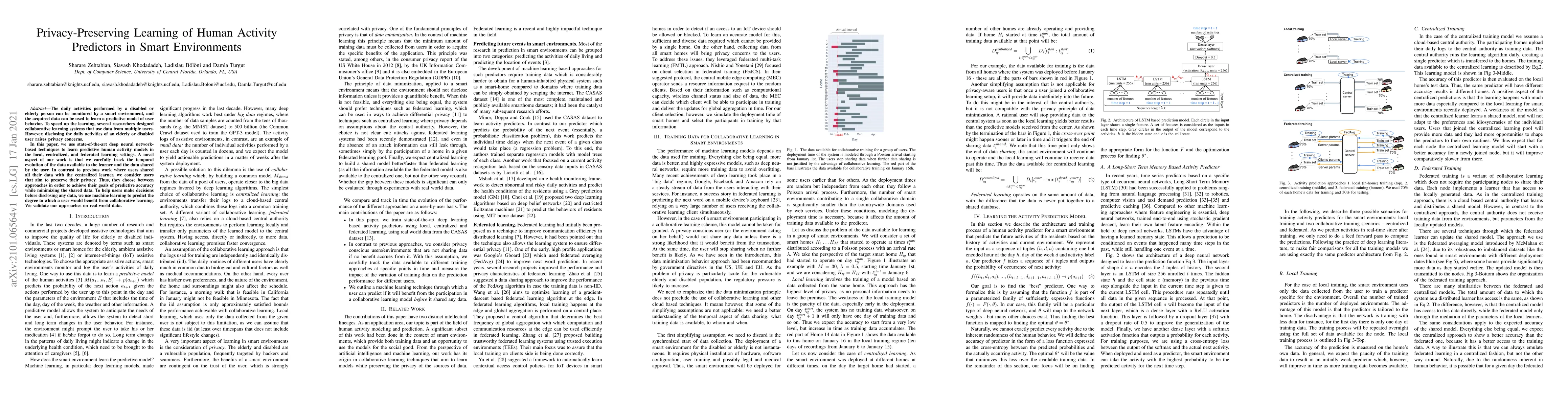 The daily activities performed by a disabled or elderly person can be monitored by a smart environment, and the acquired data can be used to learn a predictive model of user behavior. To speed up the learning, several researchers designed collaborative learning systems that use data from multiple users. However, disclosing the daily activities of an elderly or disabled user raises privacy concerns. In this paper, we use state-of-the-art deep neural network-based techniques to learn predictive human activity models in the local, centralized, and federated learning settings. A novel aspect of our work is that we carefully track the temporal evolution of the data available to the learner and the data shared by the user. In contrast to previous work where users shared all their data with the centralized learner, we consider users that aim to preserve their privacy. Thus, they choose between approaches in order to achieve their goals of predictive accuracy while minimizing the shared data. To help users make decisions before disclosing any data, we use machine learning to predict the degree to which a user would benefit from collaborative learning. We validate our approaches on real-world data.