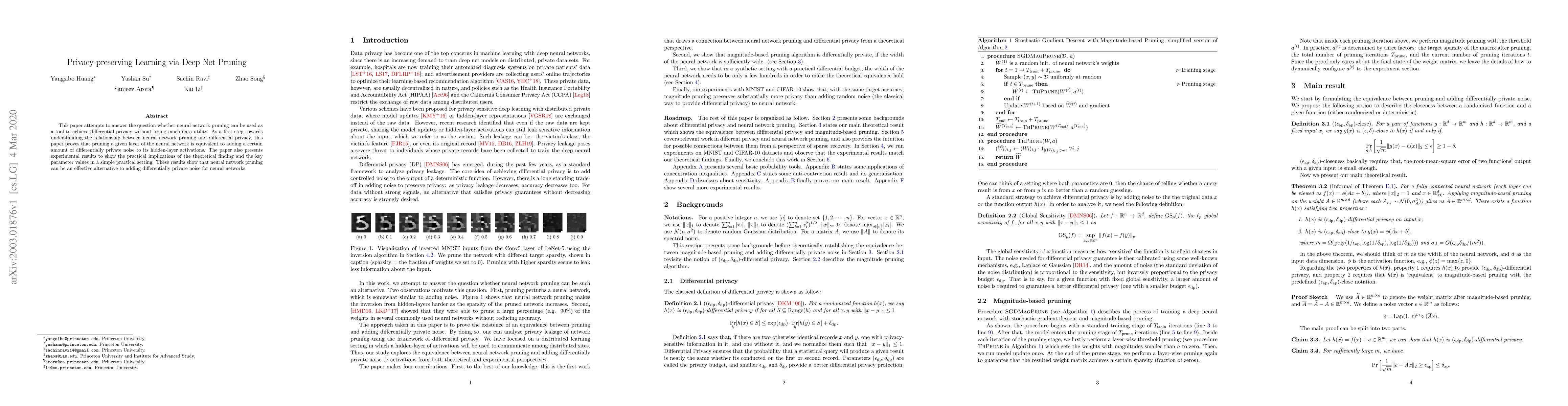 This paper explores neural network pruning as a method for achieving differential privacy while maintaining data utility, demonstrating that pruning a network layer is equivalent to adding differentially private noise. Experimental results suggest that pruning can be more effective than traditional noise addition for preserving privacy.