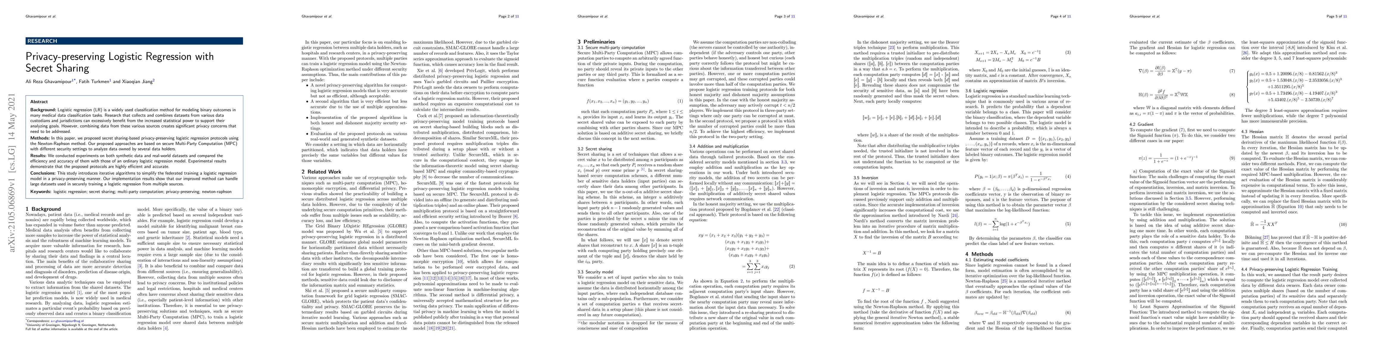 This paper proposes secret sharing-based protocols for privacy-preserving logistic regression using secure Multi-Party Computation. Experiments show that the methods are efficient and accurate, enabling federated training on large datasets while maintaining data privacy.