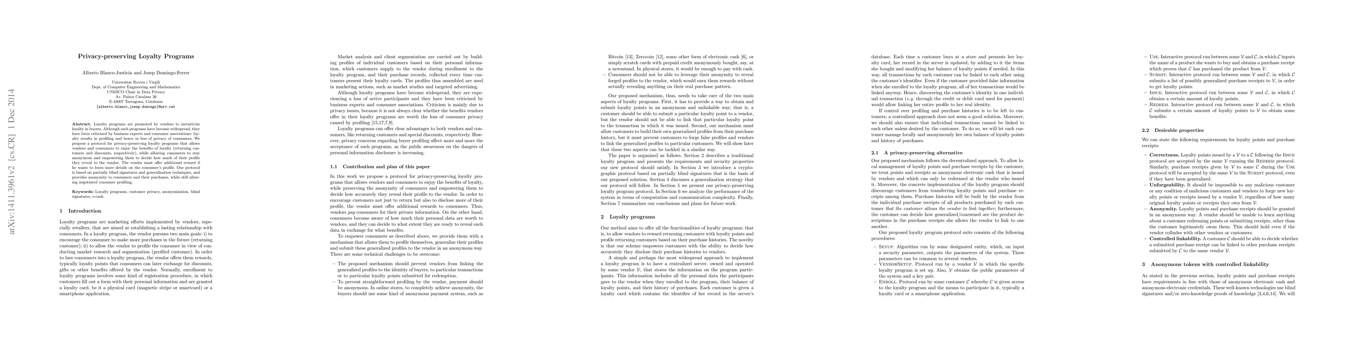This paper proposes a protocol for privacy-preserving loyalty programs that enables consumers to benefit from discounts while maintaining anonymity. Vendors can only access detailed consumer profiles if they offer additional rewards, ensuring consumers control over their data.