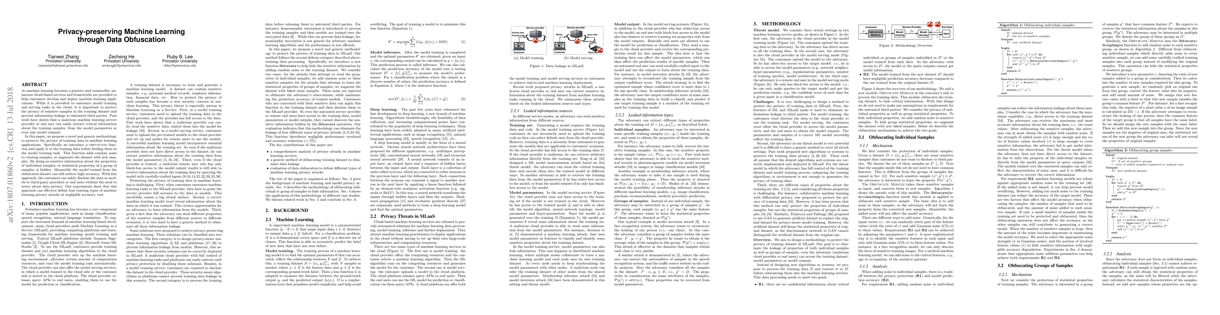 As machine learning becomes a practice and commodity, numerous cloud-based services and frameworks are provided to help customers develop and deploy machine learning applications. While it is prevalent to outsource model training and serving tasks in the cloud, it is important to protect the privacy of sensitive samples in the training dataset and prevent information leakage to untrusted third parties. Past work have shown that a malicious machine learning service provider or end user can easily extract critical information about the training samples, from the model parameters or even just model outputs. In this paper, we propose a novel and generic methodology to preserve the privacy of training data in machine learning applications. Specifically we introduce an obfuscate function and apply it to the training data before feeding them to the model training task. This function adds random noise to existing samples, or augments the dataset with new samples. By doing so sensitive information about the properties of individual samples, or statistical properties of a group of samples, is hidden. Meanwhile the model trained from the obfuscated dataset can still achieve high accuracy. With this approach, the customers can safely disclose the data or models to third-party providers or end users without the need to worry about data privacy. Our experiments show that this approach can effective defeat four existing types of machine learning privacy attacks at negligible accuracy cost.