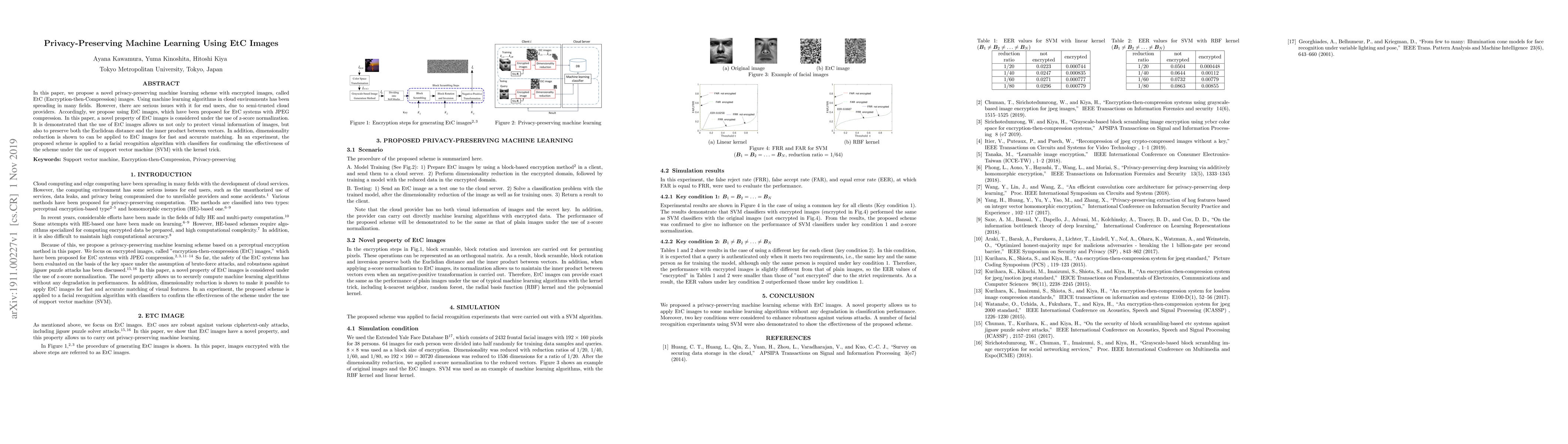 This paper introduces a privacy-preserving machine learning method using EtC images, which encrypt and compress images to protect visual data. The scheme maintains Euclidean distance and inner product, enabling effective dimensionality reduction and accurate matching, demonstrated through facial recognition using SVM.