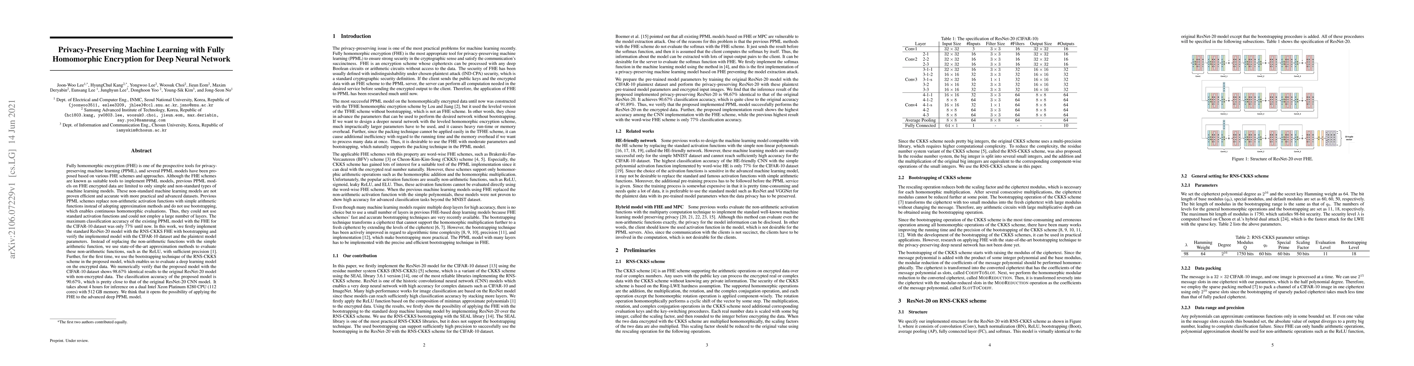 Fully homomorphic encryption (FHE) is one of the prospective tools for privacypreserving machine learning (PPML), and several PPML models have been proposed based on various FHE schemes and approaches. Although the FHE schemes are known as suitable tools to implement PPML models, previous PPML models on FHE encrypted data are limited to only simple and non-standard types of machine learning models. These non-standard machine learning models are not proven efficient and accurate with more practical and advanced datasets. Previous PPML schemes replace non-arithmetic activation functions with simple arithmetic functions instead of adopting approximation methods and do not use bootstrapping, which enables continuous homomorphic evaluations. Thus, they could not use standard activation functions and could not employ a large number of layers. The maximum classification accuracy of the existing PPML model with the FHE for the CIFAR-10 dataset was only 77% until now. In this work, we firstly implement the standard ResNet-20 model with the RNS-CKKS FHE with bootstrapping and verify the implemented model with the CIFAR-10 dataset and the plaintext model parameters. Instead of replacing the non-arithmetic functions with the simple arithmetic function, we use state-of-the-art approximation methods to evaluate these non-arithmetic functions, such as the ReLU, with sufficient precision [1]. Further, for the first time, we use the bootstrapping technique of the RNS-CKKS scheme in the proposed model, which enables us to evaluate a deep learning model on the encrypted data. We numerically verify that the proposed model with the CIFAR-10 dataset shows 98.67% identical results to the original ResNet-20 model with non-encrypted data. The classification accuracy of the proposed model is 90.67%, which is pretty close to that of the original ResNet-20 CNN model...