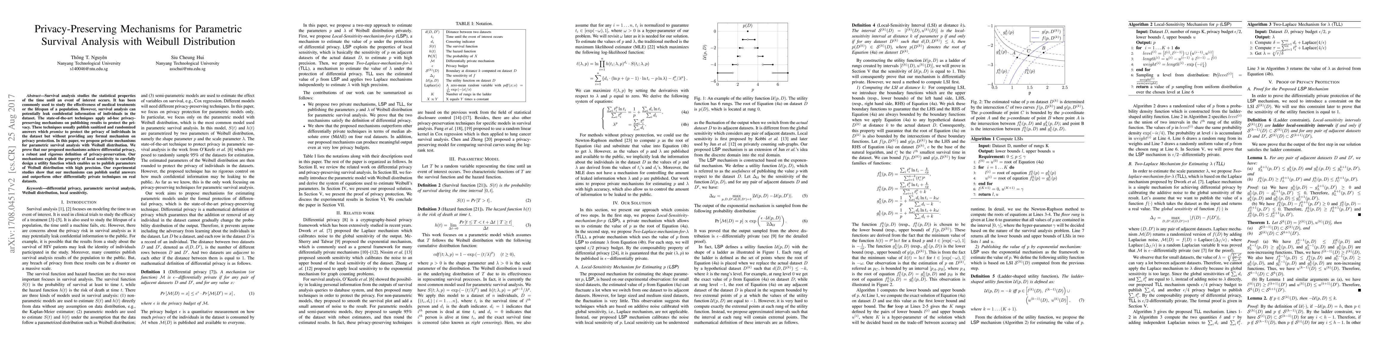 This paper proposes privacy-preserving mechanisms for parametric survival analysis using the Weibull distribution, achieving differential privacy to protect individual data confidentiality. The proposed mechanisms outperform existing methods in maintaining data utility while ensuring rigorous privacy protection.