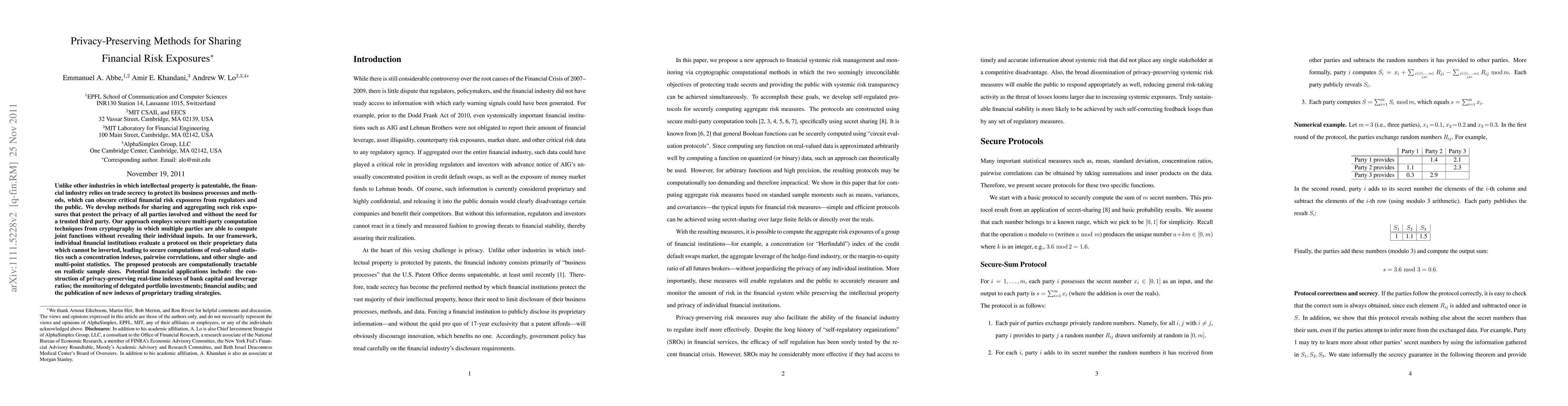 Unlike other industries in which intellectual property is patentable, the financial industry relies on trade secrecy to protect its business processes and methods, which can obscure critical financial risk exposures from regulators and the public. We develop methods for sharing and aggregating such risk exposures that protect the privacy of all parties involved and without the need for a trusted third party. Our approach employs secure multi-party computation techniques from cryptography in which multiple parties are able to compute joint functions without revealing their individual inputs. In our framework, individual financial institutions evaluate a protocol on their proprietary data which cannot be inverted, leading to secure computations of real-valued statistics such a concentration indexes, pairwise correlations, and other single- and multi-point statistics. The proposed protocols are computationally tractable on realistic sample sizes. Potential financial applications include: the construction of privacy-preserving real-time indexes of bank capital and leverage ratios; the monitoring of delegated portfolio investments; financial audits; and the publication of new indexes of proprietary trading strategies.