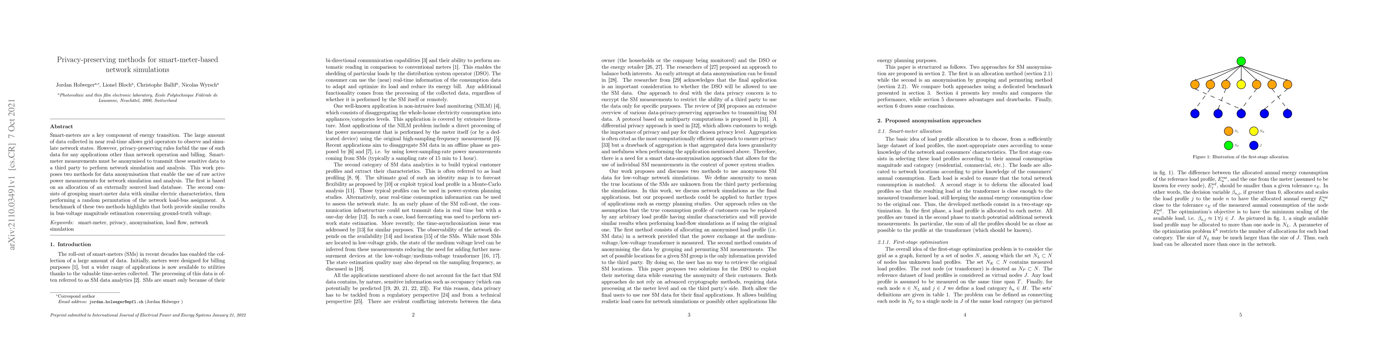 This paper proposes two privacy-preserving methods for anonymizing smart-meter data to enable network simulations. The first method uses an external load database, while the second groups and permutes similar electric characteristics. Both methods show comparable accuracy in estimating bus-voltage magnitudes.