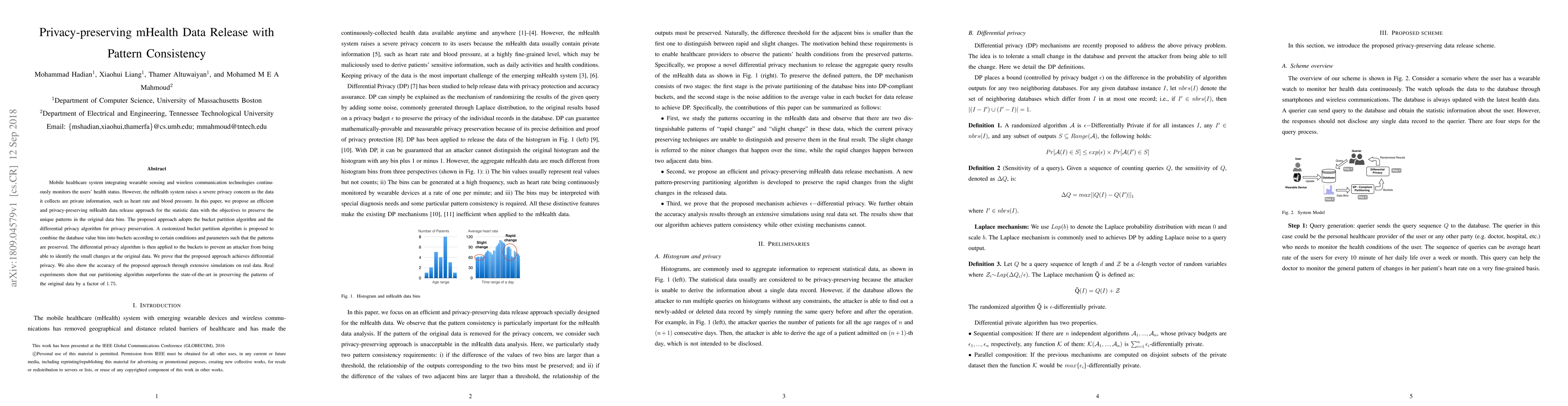 This paper proposes an efficient privacy-preserving method for releasing mHealth data, using a customized bucket partition algorithm and differential privacy to maintain data patterns while protecting individual privacy. Experimental results demonstrate superior pattern preservation compared to existing methods.