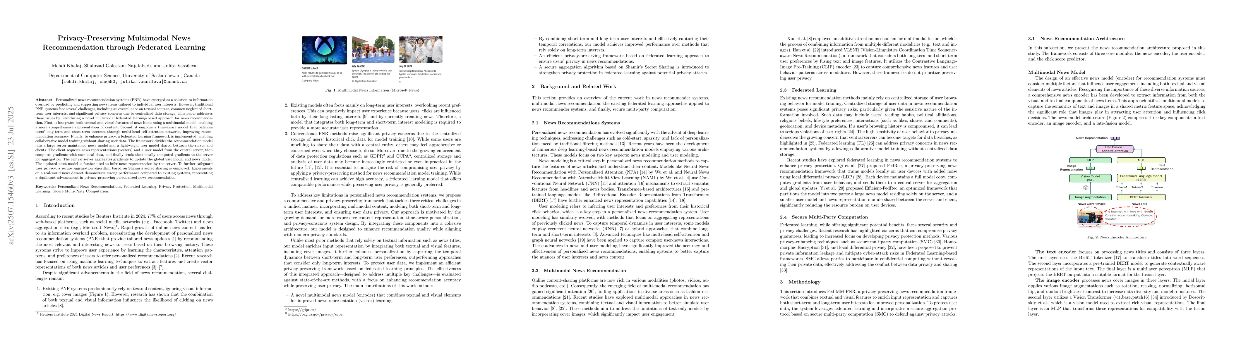 Personalized News Recommendation systems (PNR) have emerged as a solution to information overload by predicting and suggesting news items tailored to individual user interests. However, traditional PNR systems face several challenges, including an overreliance on textual content, common neglect of short-term user interests, and significant privacy concerns due to centralized data storage. This paper addresses these issues by introducing a novel multimodal federated learning-based approach for news recommendation. First, it integrates both textual and visual features of news items using a multimodal model, enabling a more comprehensive representation of content. Second, it employs a time-aware model that balances users' long-term and short-term interests through multi-head self-attention networks, improving recommendation accuracy. Finally, to enhance privacy, a federated learning framework is implemented, enabling collaborative model training without sharing user data. The framework divides the recommendation model into a large server-maintained news model and a lightweight user model shared between the server and clients. The client requests news representations (vectors) and a user model from the central server, then computes gradients with user local data, and finally sends their locally computed gradients to the server for aggregation. The central server aggregates gradients to update the global user model and news model. The updated news model is further used to infer news representation by the server. To further safeguard user privacy, a secure aggregation algorithm based on Shamir's secret sharing is employed. Experiments on a real-world news dataset demonstrate strong performance compared to existing systems, representing a significant advancement in privacy-preserving personalized news recommendation.