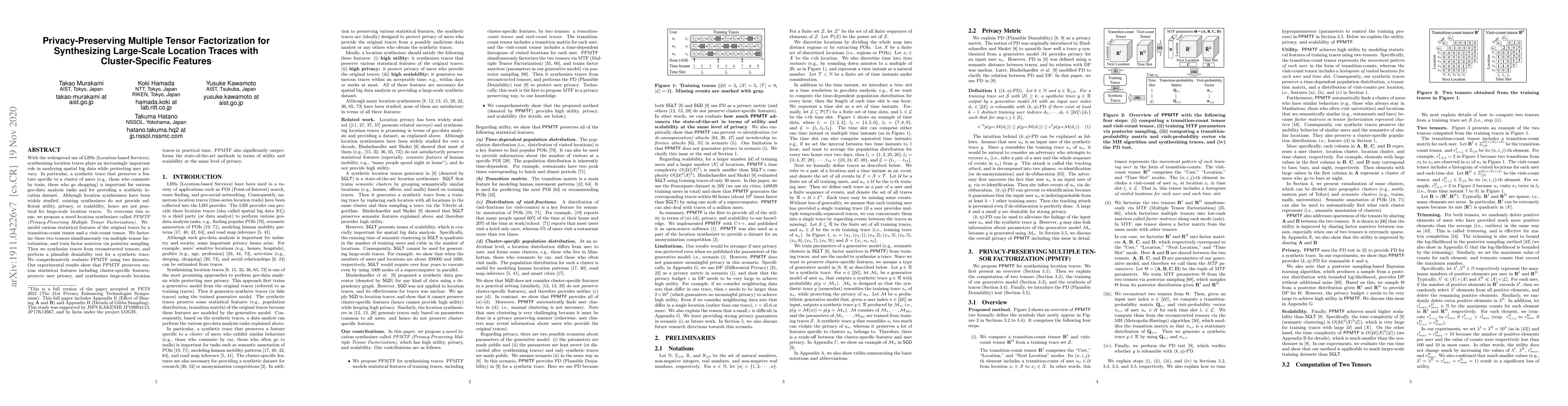This paper proposes PPMTF, a novel privacy-preserving synthesizer for large-scale location traces that maintains cluster-specific features. It uses multiple tensor factorization to model and synthesize location data while protecting user privacy and achieving scalability.