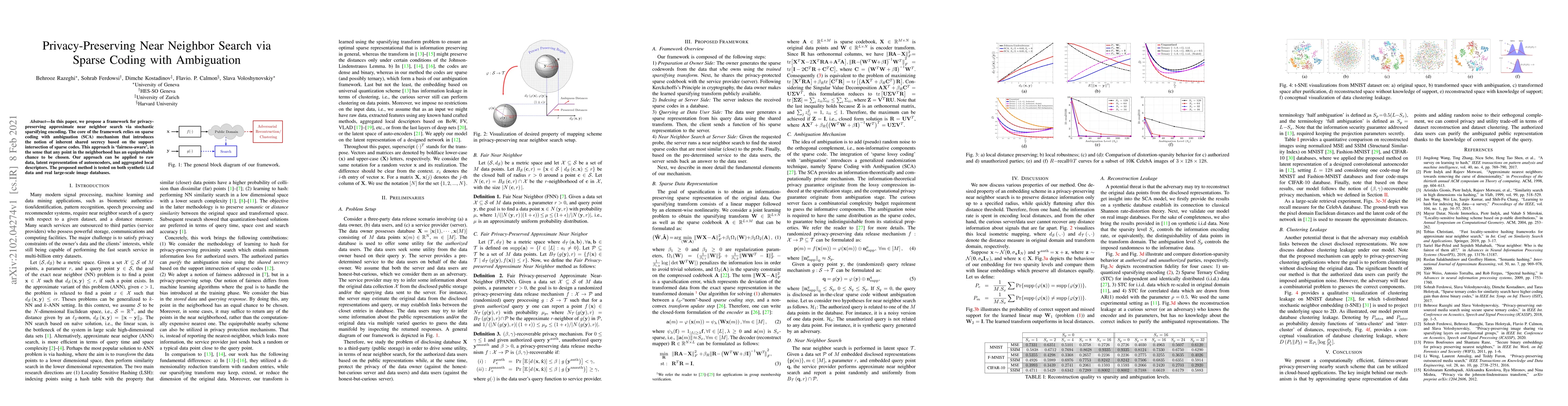 This paper introduces a privacy-preserving framework for approximate near neighbor search using stochastic sparsifying encoding and sparse coding with ambiguation (SCA). The SCA mechanism ensures fairness by providing equiprobable chances for any point in the neighborhood to be selected. The method is tested on synthetic and real large-scale image datasets.