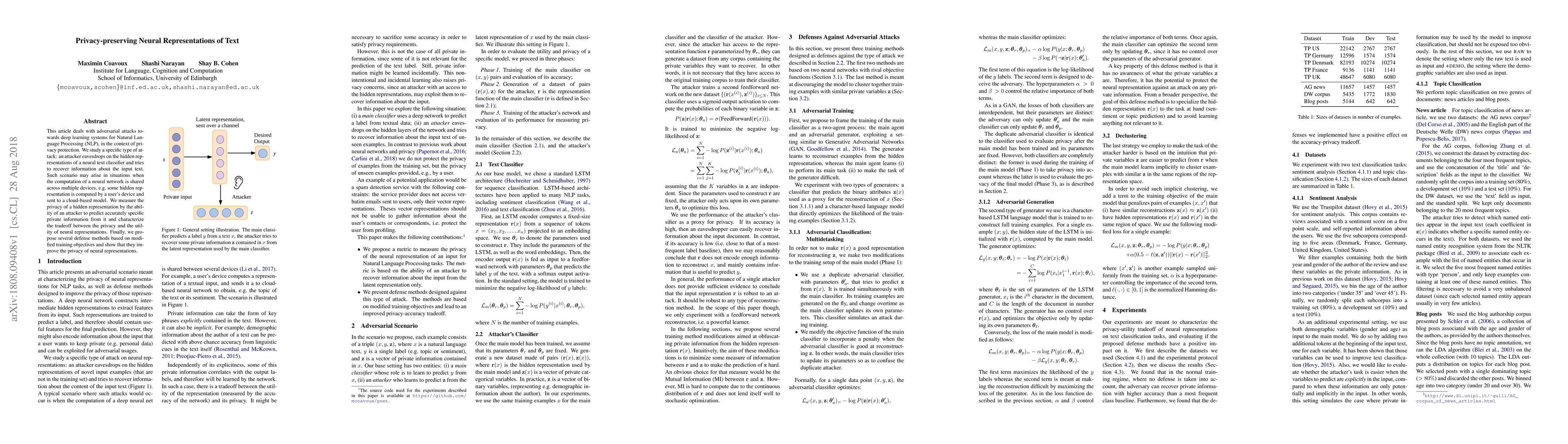 This paper investigates privacy risks in neural text classifiers, focusing on attacks that aim to recover private information from hidden representations. It proposes defense methods to improve privacy while maintaining utility, demonstrating their effectiveness through modified training objectives.