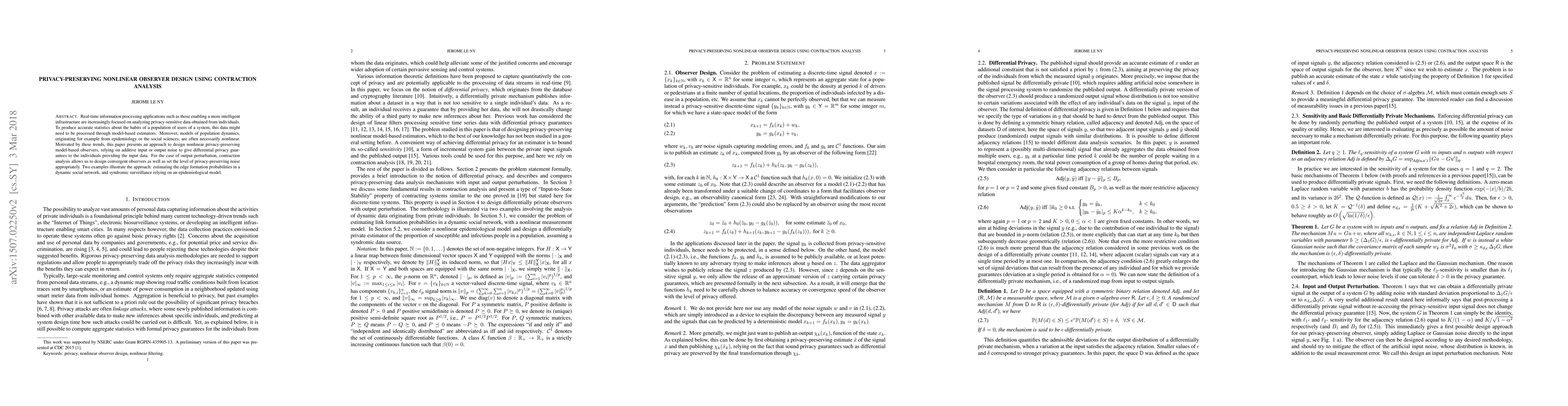This paper presents a method for designing nonlinear privacy-preserving observers using contraction analysis to ensure differential privacy in real-time data processing. It applies additive noise to provide privacy guarantees and includes examples for dynamic social network analysis and syndromic surveillance.