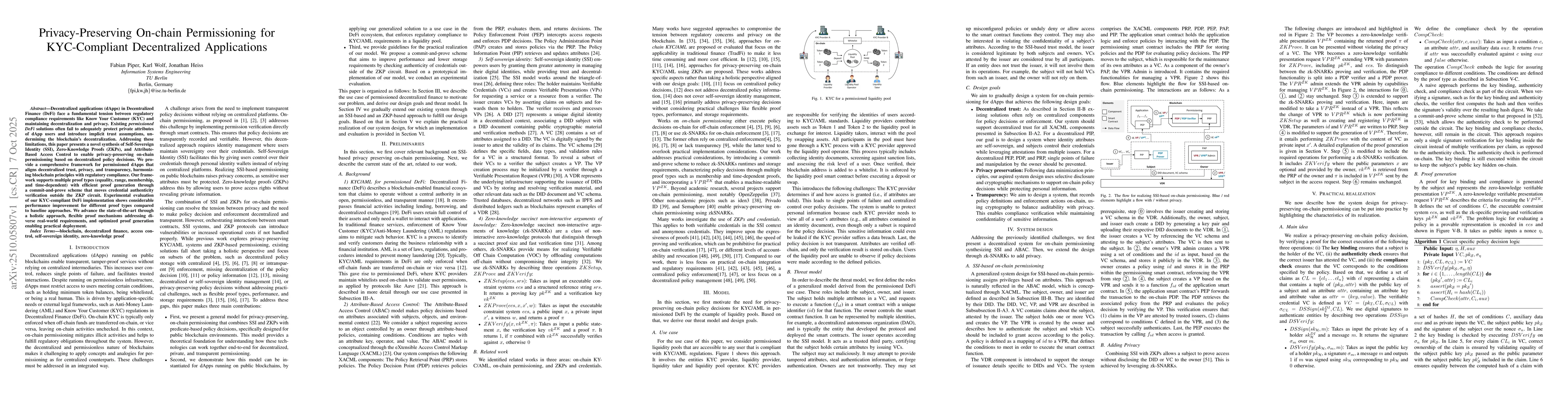 The research combines self-sovereign identity (SSI) with zero-knowledge proofs (ZKPs) to develop a privacy-preserving on-chain permissioning model. It integrates decentralized identifiers (DIDs), verifiable credentials (VCs), and zk-SNARKs to enable secure, non-disclosing access control for decentralized applications (dApps).