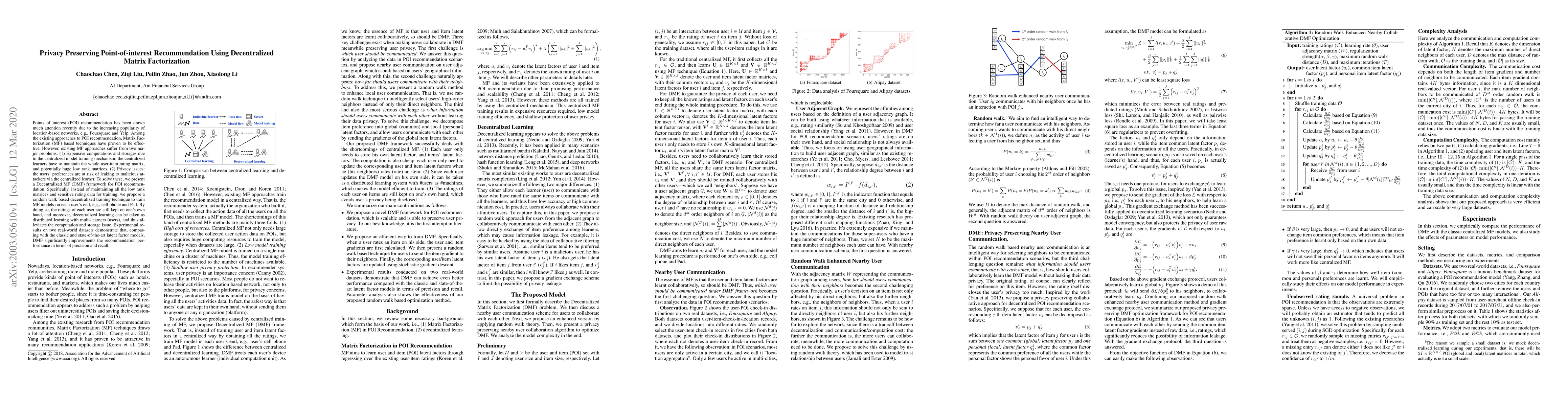 Points of interest (POI) recommendation has been drawn much attention recently due to the increasing popularity of location-based networks, e.g., Foursquare and Yelp. Among the existing approaches to POI recommendation, Matrix Factorization (MF) based techniques have proven to be effective. However, existing MF approaches suffer from two major problems: (1) Expensive computations and storages due to the centralized model training mechanism: the centralized learners have to maintain the whole user-item rating matrix, and potentially huge low rank matrices. (2) Privacy issues: the users' preferences are at risk of leaking to malicious attackers via the centralized learner. To solve these, we present a Decentralized MF (DMF) framework for POI recommendation. Specifically, instead of maintaining all the low rank matrices and sensitive rating data for training, we propose a random walk based decentralized training technique to train MF models on each user's end, e.g., cell phone and Pad. By doing so, the ratings of each user are still kept on one's own hand, and moreover, decentralized learning can be taken as distributed learning with multi-learners (users), and thus alleviates the computation and storage issue. Experimental results on two real-world datasets demonstrate that, comparing with the classic and state-of-the-art latent factor models, DMF significantly improvements the recommendation performance in terms of precision and recall.
